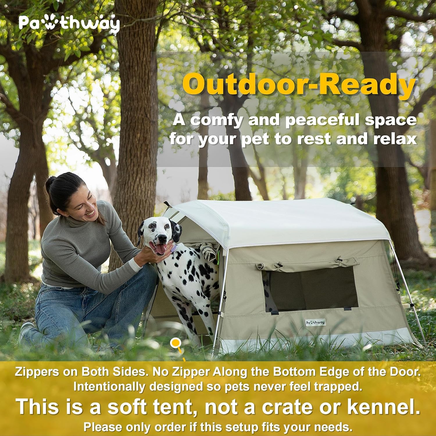 - This Is a Soft Tent, Not a Crate or Kennel: The door zips on both sides, with no zipper along the bottom edgeâso your pet can rest or hide without feeling trapped or stressed. This is an intentional design, not a flaw. Do not leave your pet unattended inside the tent, especially in outdoor or unfamiliar settings. Please only order if this setup fits your needs.