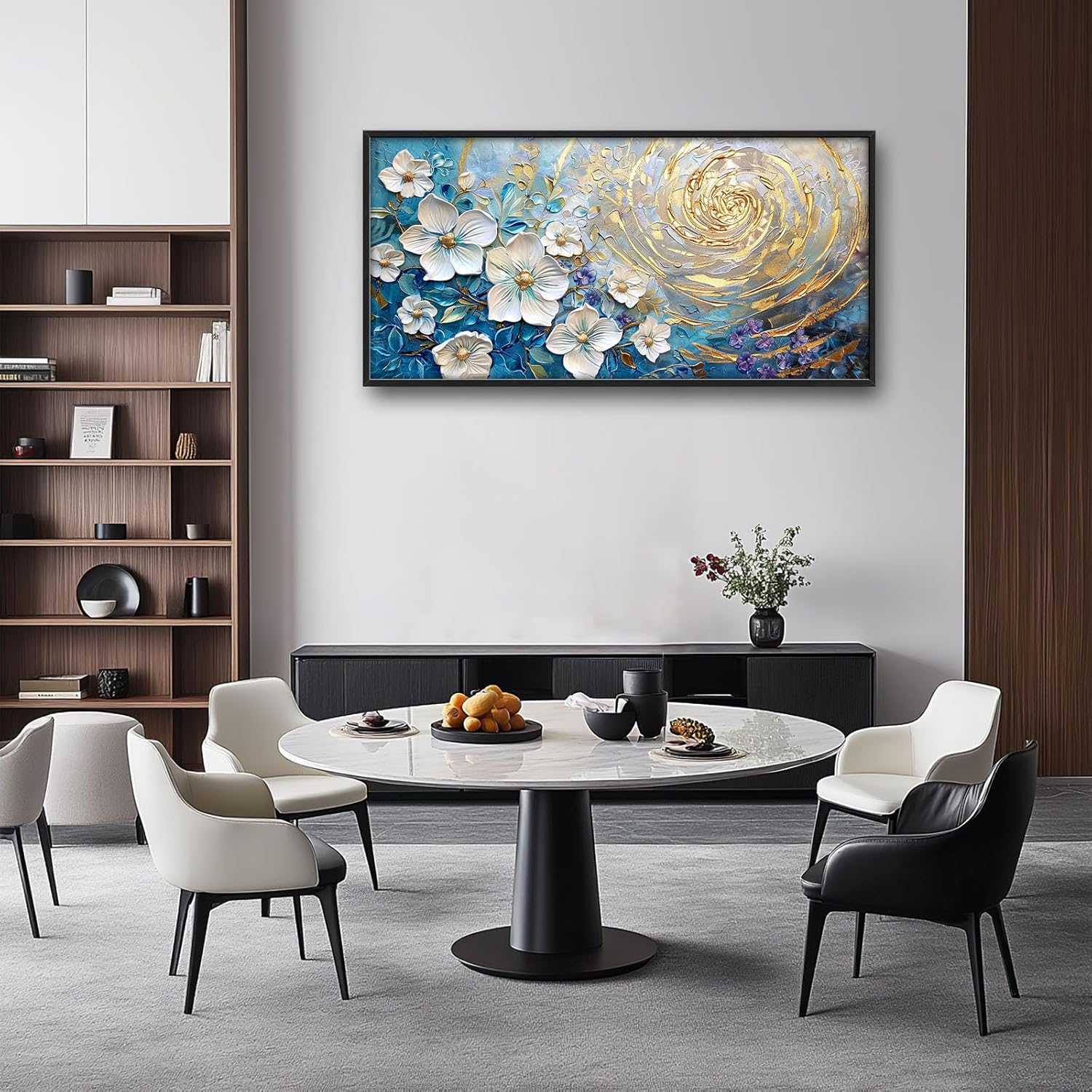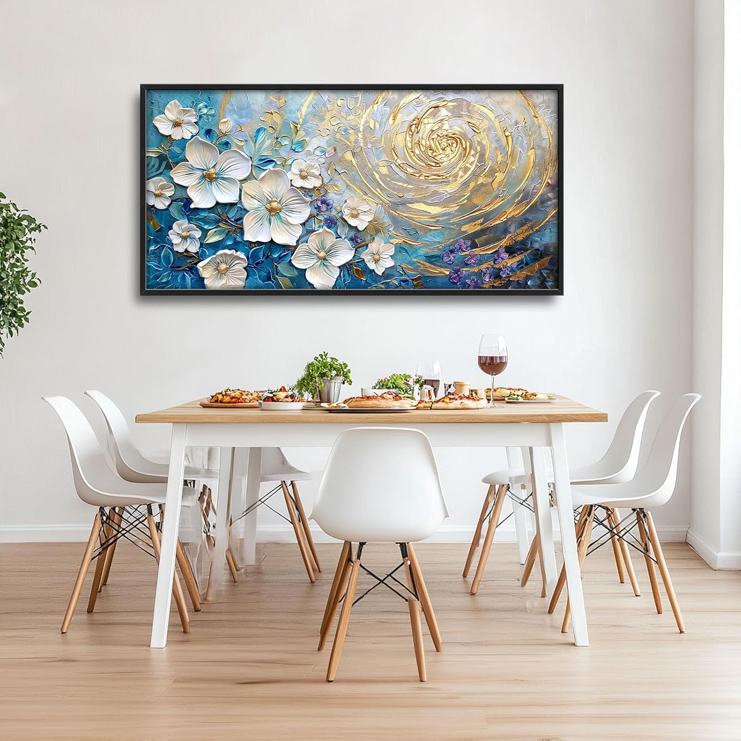 - 【Unique Design】4D textured white flowers, with blue and gold swirls in the background, in a painting with white, gold, and silver textures.