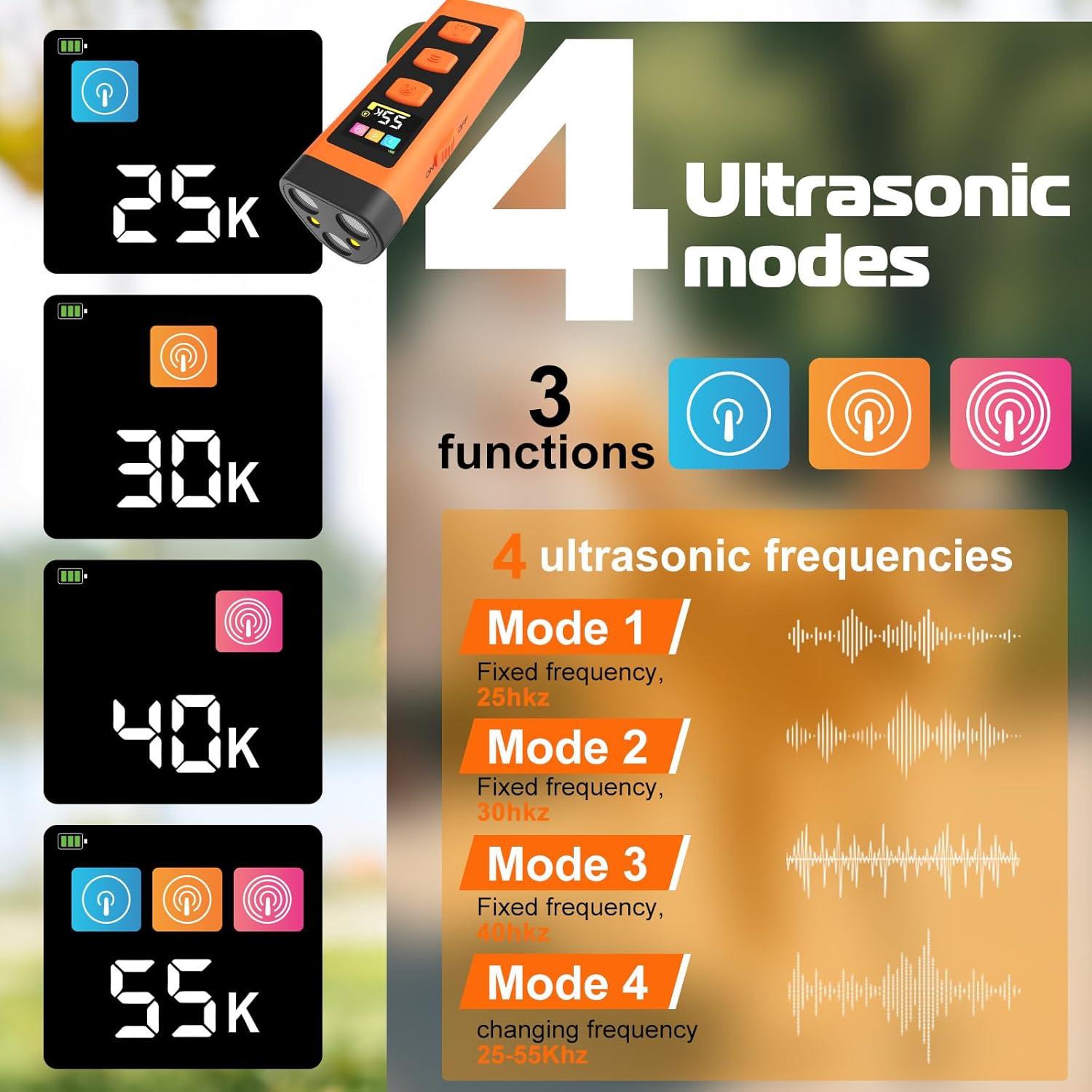 - 【Smart Triple-Mode Adjustable System】:Featuring LED light, ultrasonic, and sound modes, this device offers customizable training with 4 ultrasonic intensity levels and 5 sound frequencies (25kHz-55kHz). The clear LED display shows active modes and battery status for easy use, while the 8-second auto-stop ensures safe, controlled sessions every time.