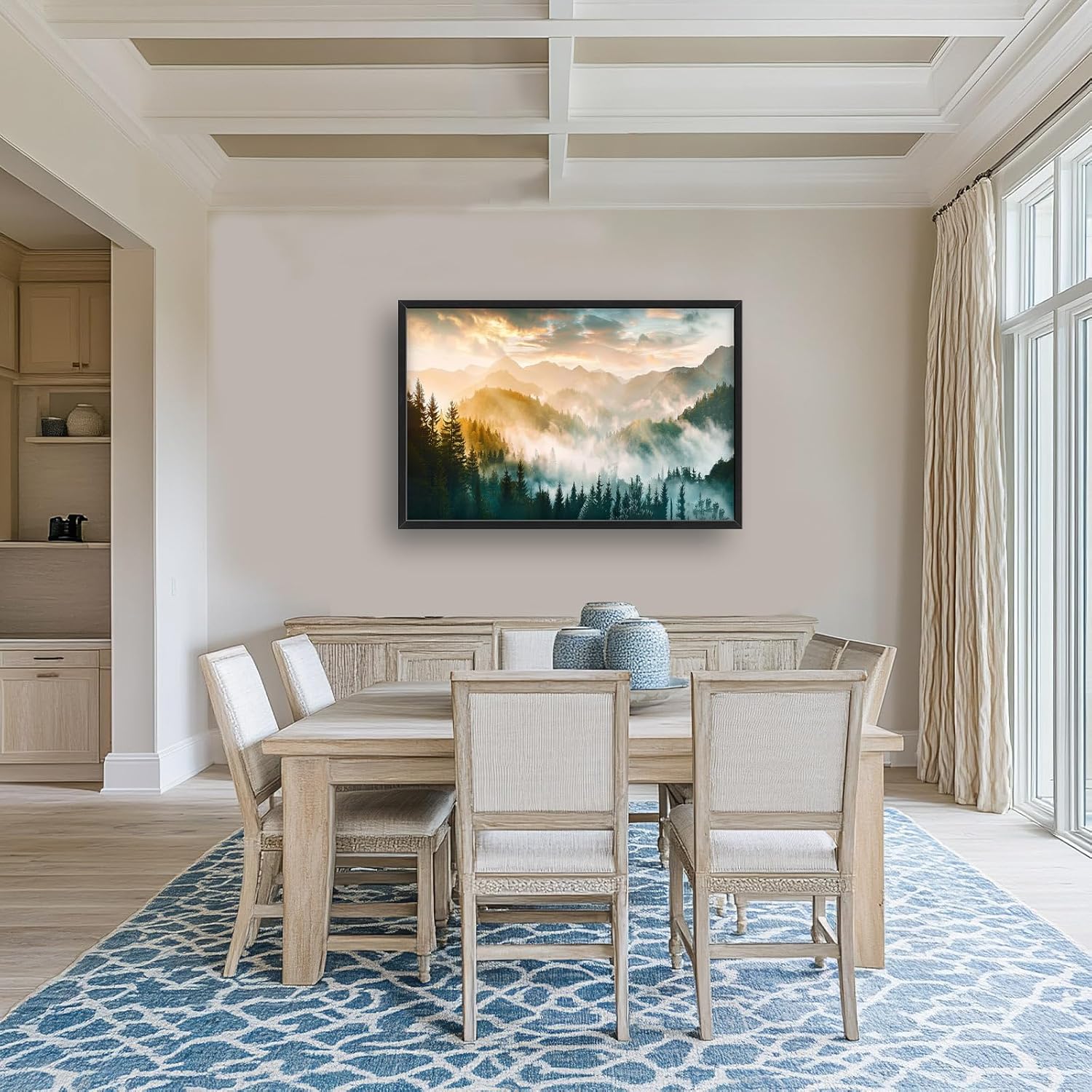 - 【Unique Design】A panoramic view of mist-covered mountains and dense forests, bathed in the soft glow of sunrise. The scene captures an enchanting atmosphere with ethereal clouds and gentle sunlight filtering through the trees.