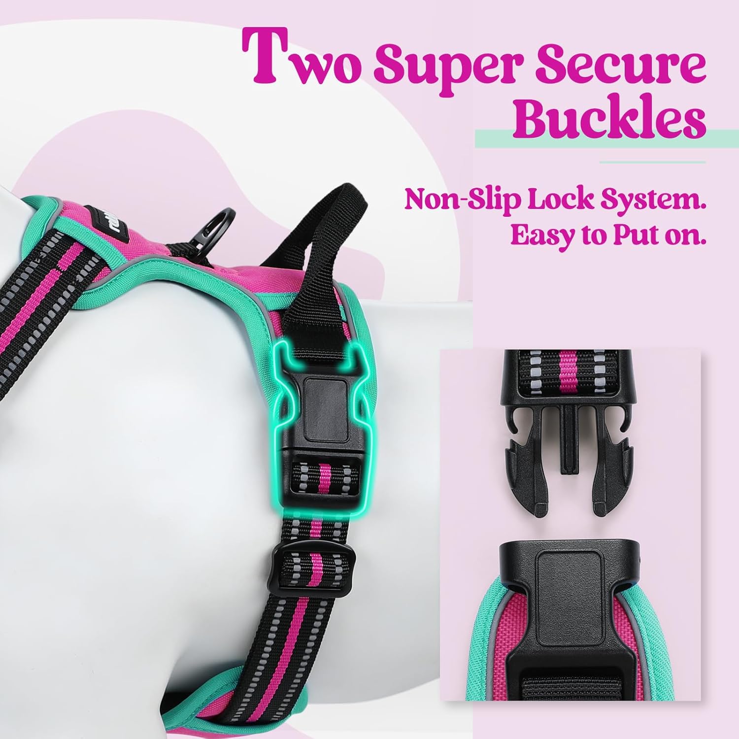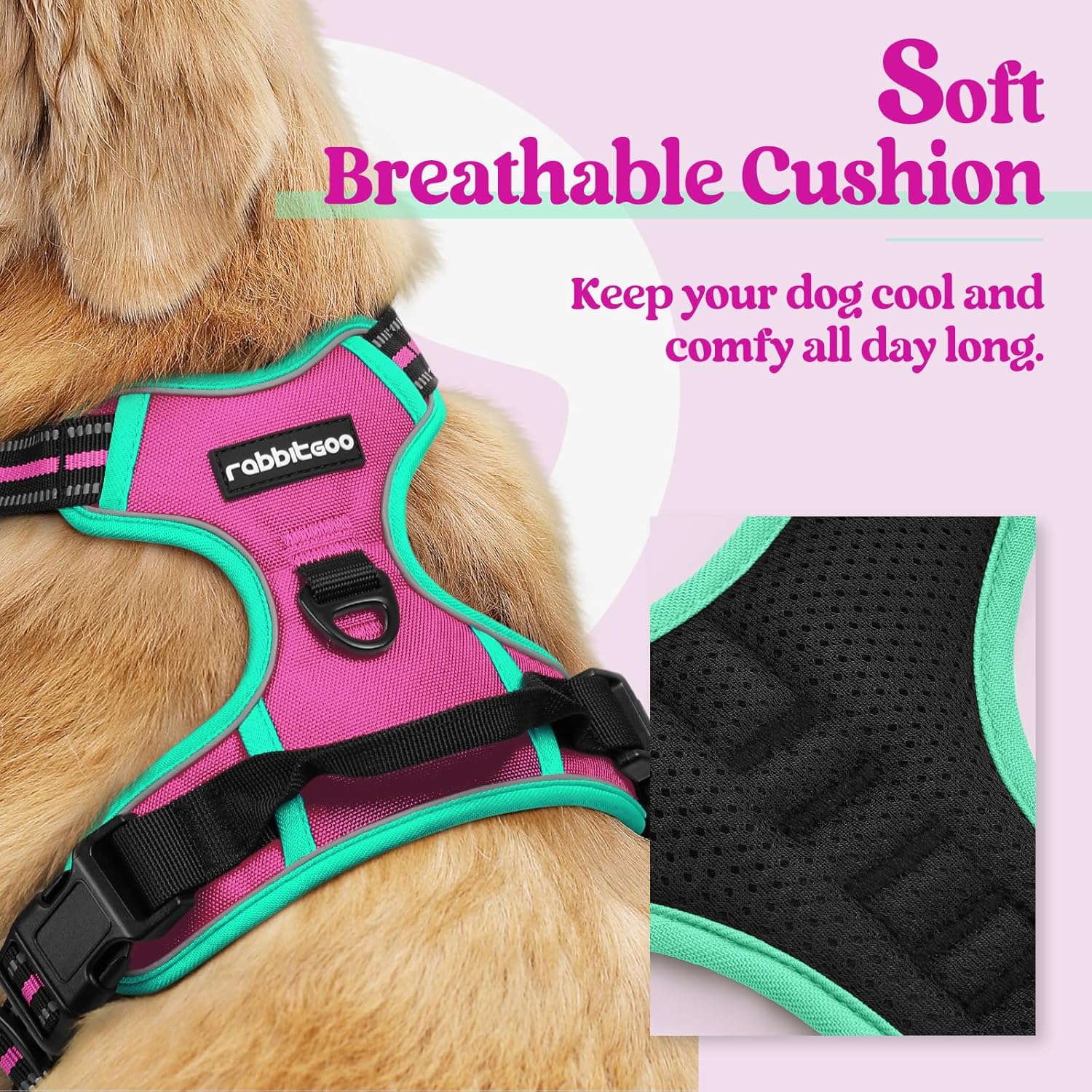 rabbitgoo Dog Harness No Pull with 2 Leash Clips, Adjustable Soft Padded, Reflective Oxford No Choke Pet Vest with Easy Control Handle for Large Dogs, Hot Pink & Turquoise, L