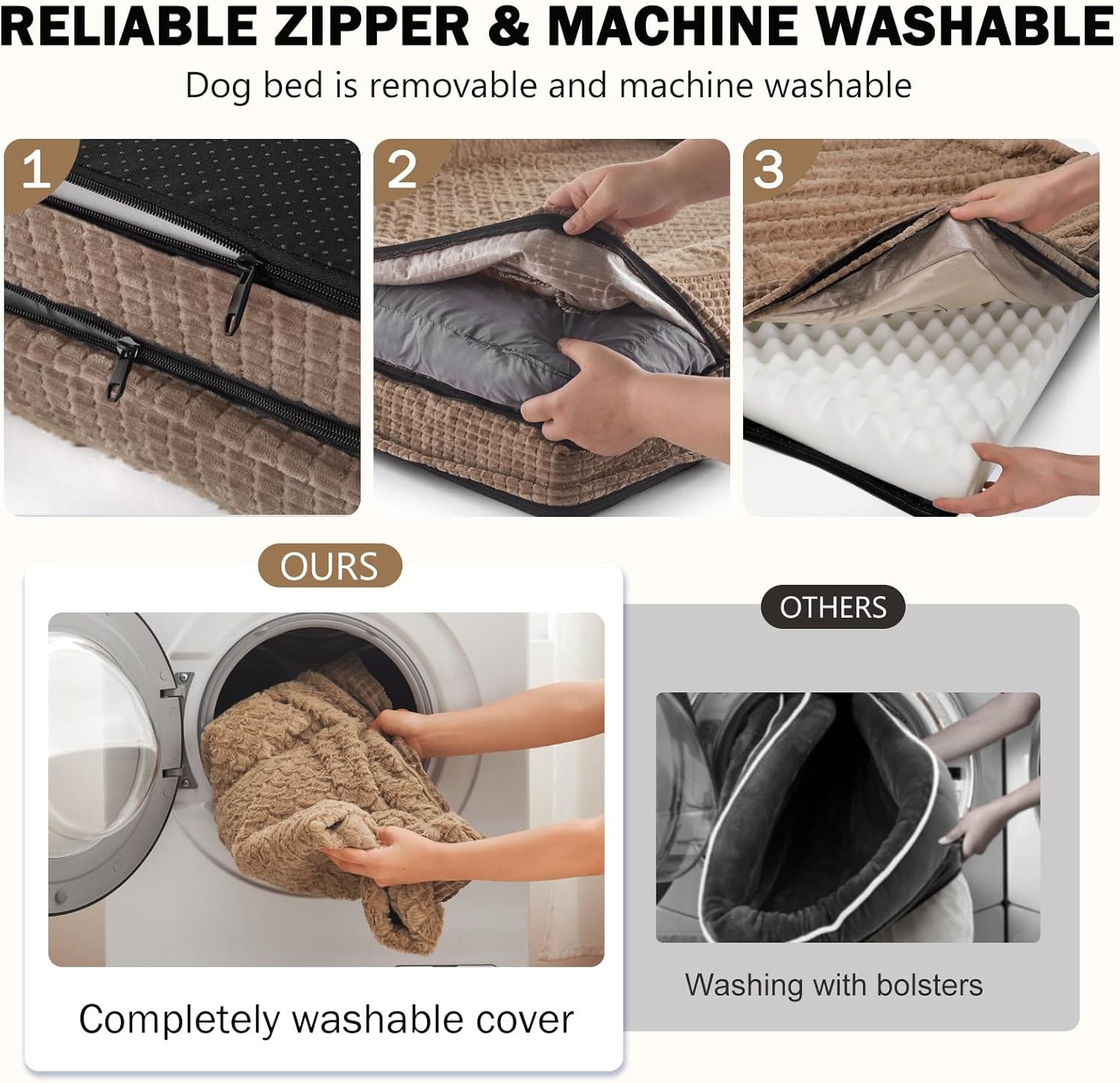 - 🐶WATERPROOF & WASHABLE DOG BED: The dog bed features a fully removable, machine-washable cover with a smooth double zipper for easy to quick remove and care, so just throw it in the washing machine and will be as good as new, ensuring your pet's space stays fresh and hygienic. The waterproof inner lining on the back of the dog bed cover fully protect the egg crate foam from spills, water damage, or accidents, prolonging the product's life.