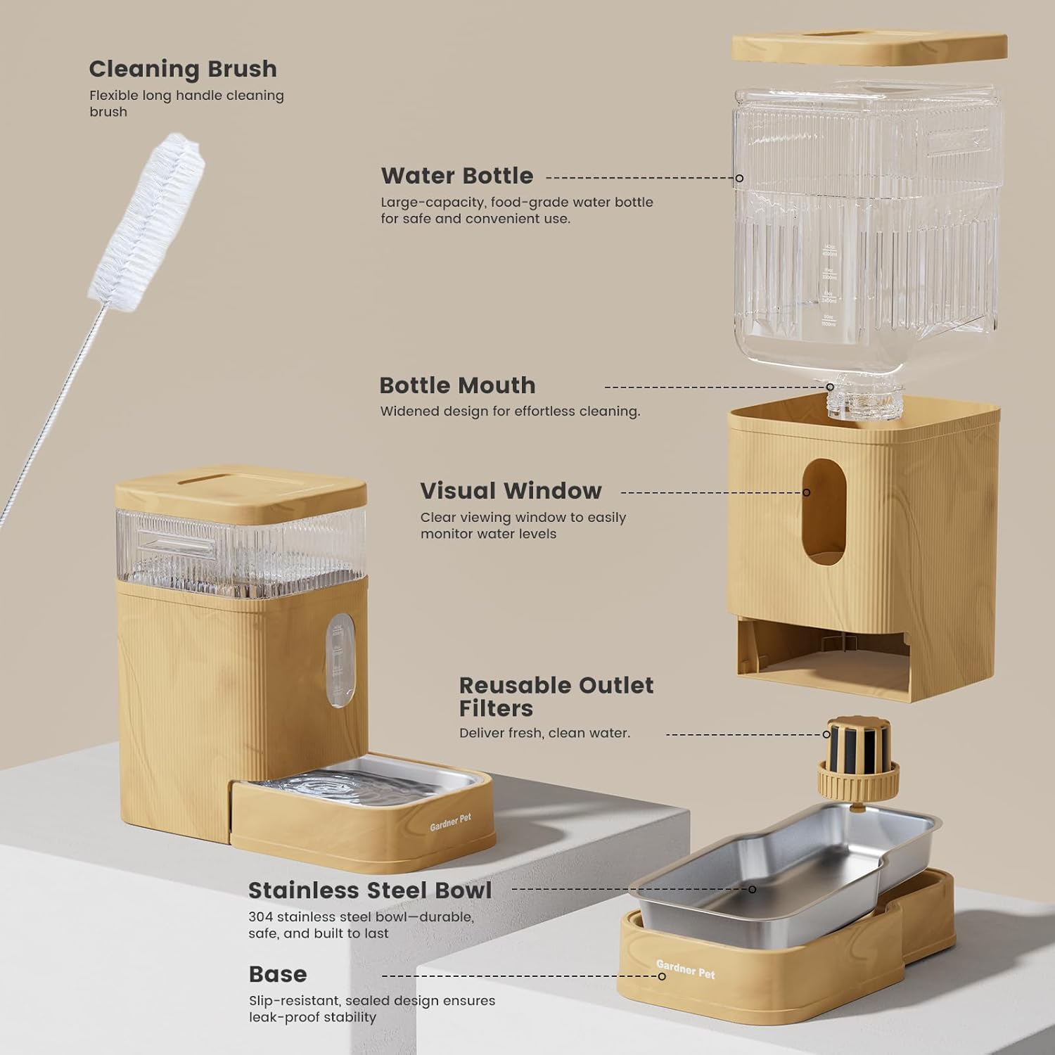 - Premium Pet-Safe Materials - Gardner Pert dog water bowl dispenser comes with 304 stainless steel bowl + cleaning brush guarantees a safe, easy-to-clean water supply for pets.