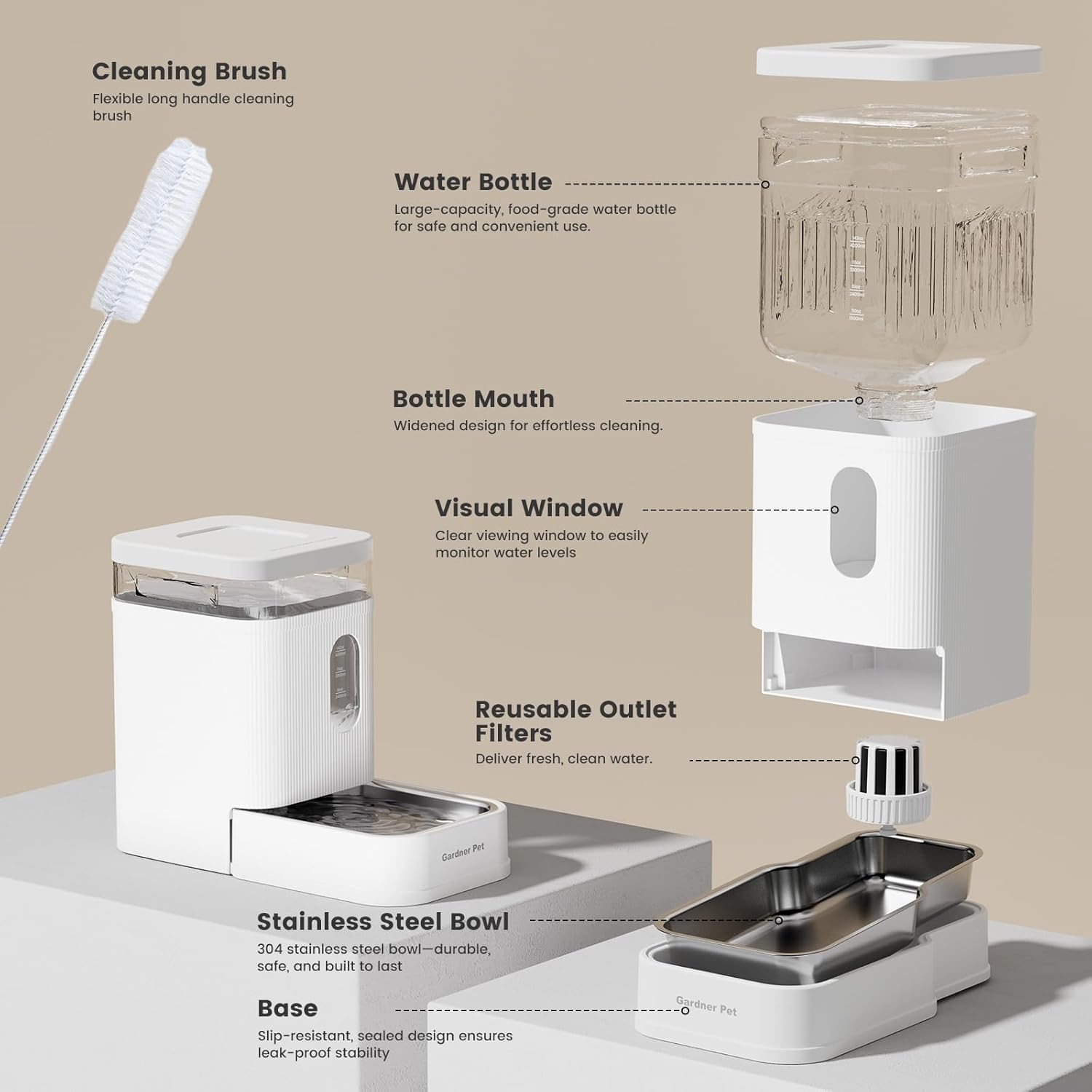 - Premium Pet-Safe Materials - Gardner Pert dog water bowl dispenser comes with 304 stainless steel bowl + cleaning brush guarantees a safe, easy-to-clean water supply for pets.