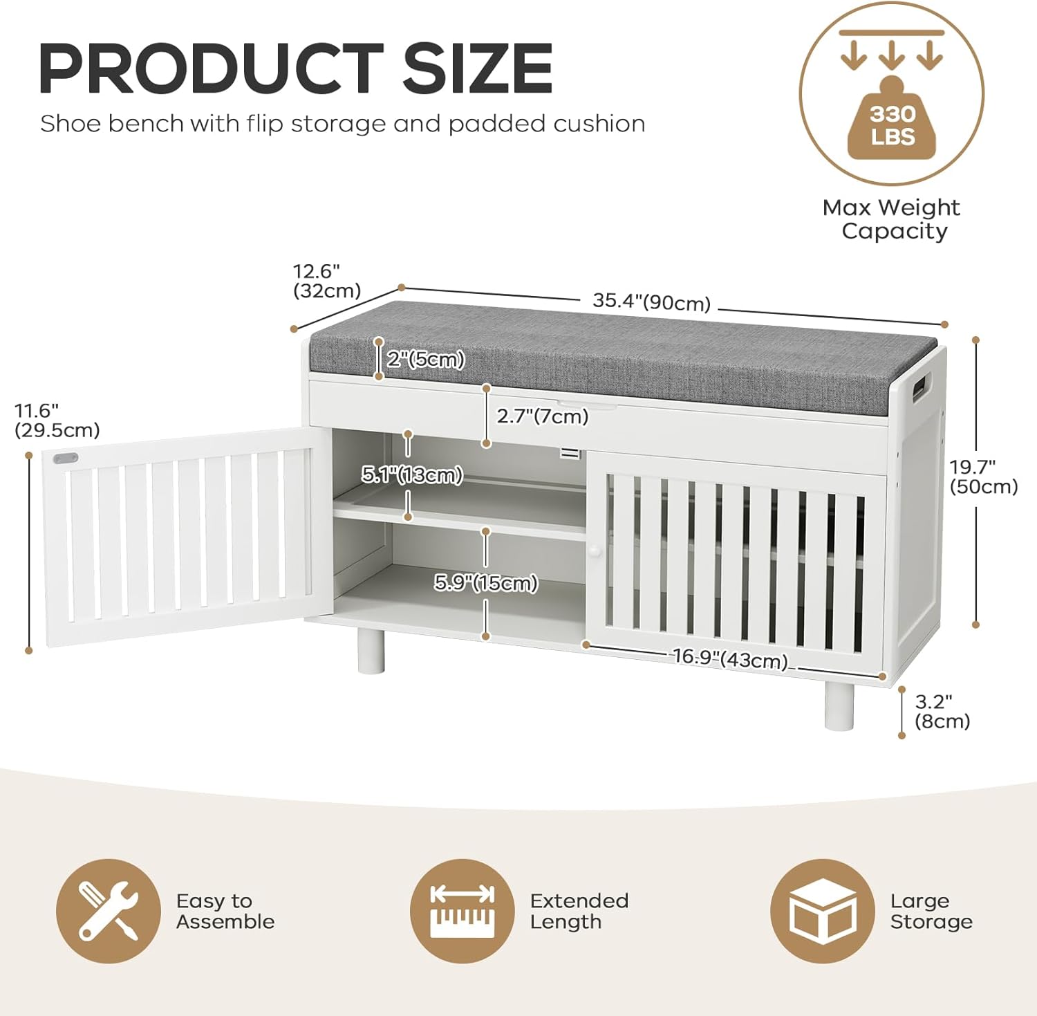 Storage Bench, Bamboo Shoe Bench with Padded Seat Cushion & 2 Doors, 2-Tier Entryway Bench with Lift Top Hidden Storage, 35.4" W x 12.6" D x 19.7" H, Shoe Rack Cabinet for Entryway, Living Room, White