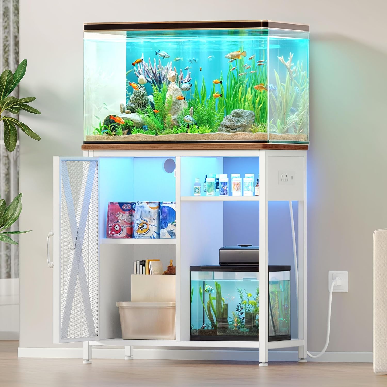 YITAHOME Fish Tank Stand with Power Outlets & LED Light, 20-29 Gallon Metal Aquarium Stand with Cabinet for Fish Tank Accessories Storage for Turtle, Reptile Terrarium, 350LBS Capacity, White