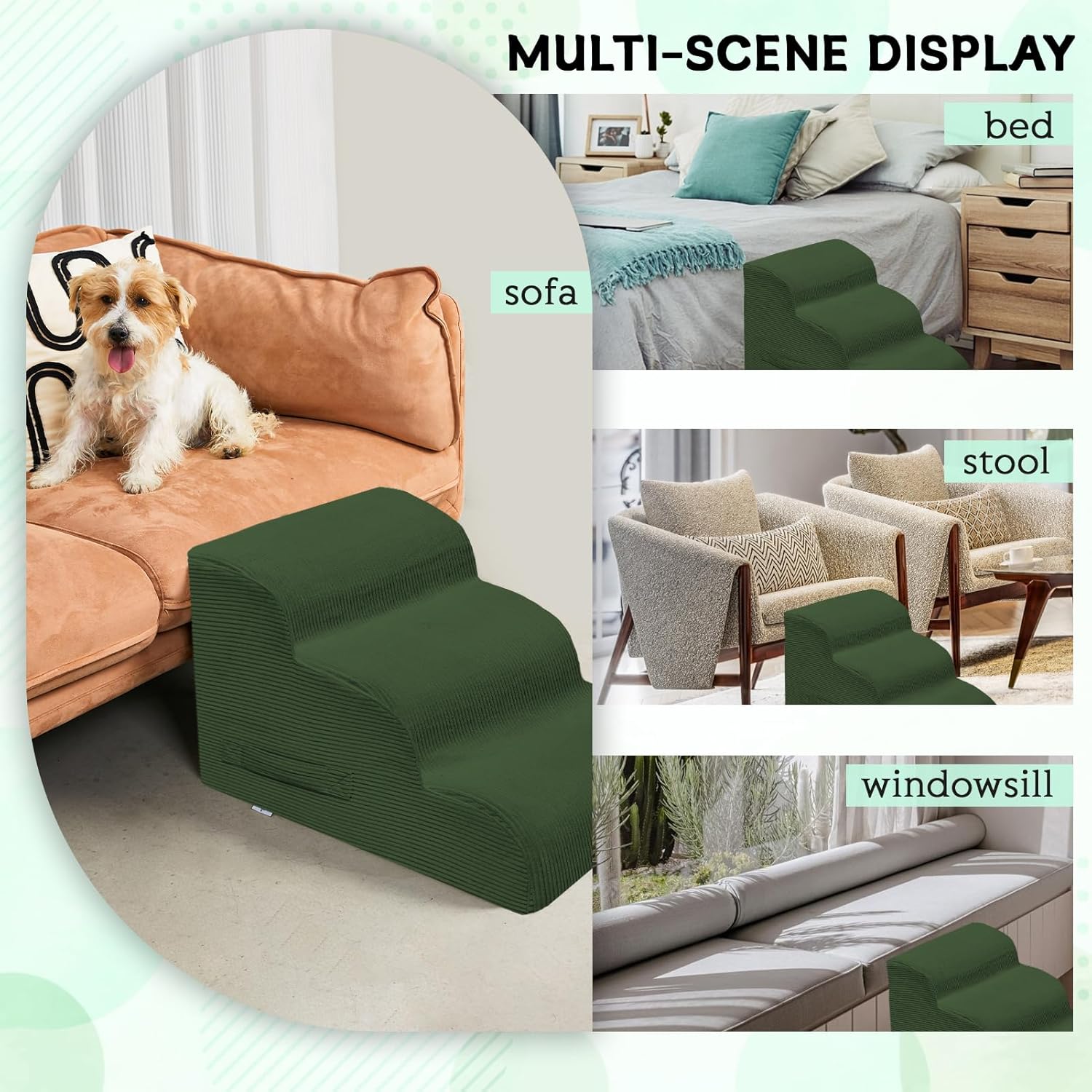Dog Steps for Small Dogs, 3-Step Pet Ramp Stairs for High Beds and Sofa, Non-Slip Pet Stairs for Small Dogs and Cats, Removable and Easy to Clean Cover, Green