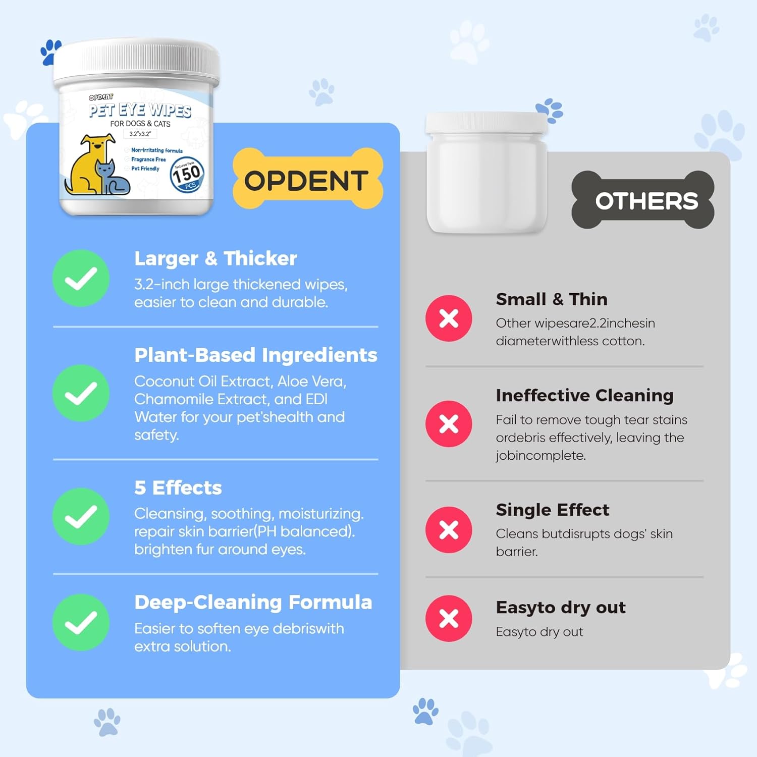 - 【Eye Wipes for Cats & Dogs】Size: 150pcs, 3.2inches in diameter. Specially designed for pet eye cleaning, effectively and quickly remove dried mucus secretions, discharge, crust. Long-term can remove and prevent tear stains & saliva stains from your pet's fur, reduce the risk of eye irritations.