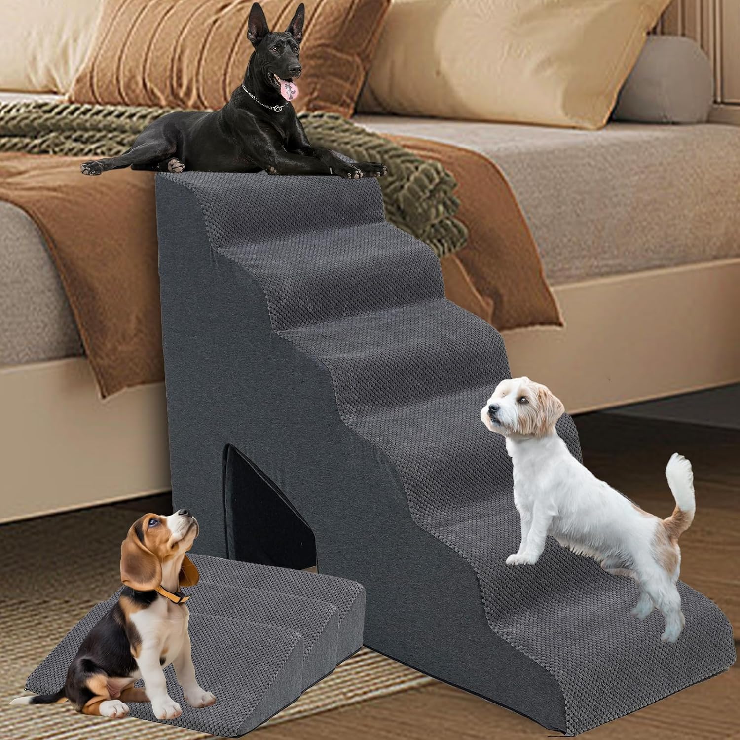 - 2025 Special new design dog stair: Our dog steps has a total of 6steps, consisting of 6 tier and 3 small steps. The connection method adopted as strong zipper form, which is very stable,if you want to buy different height stairs ,trust us ,buy this one ,because you can get 6 and 3 pack pet stairs as long as you purchase this 6-tier, which can be used at very high place and 3 pack ramps can be put on your staircase
