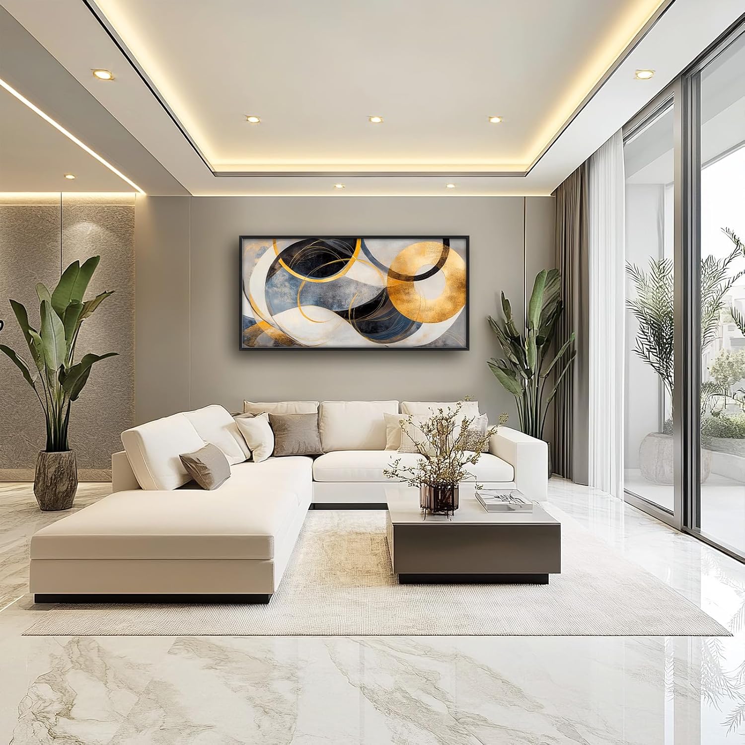 Large Abstract Wall Art for Living Room, Oversized Abstract Circle Wall Decor, Black and Golden Abstract Canvas Painting Modern Artwork Home Decoration for Living Room Bedroom Office Framed 60"x30"