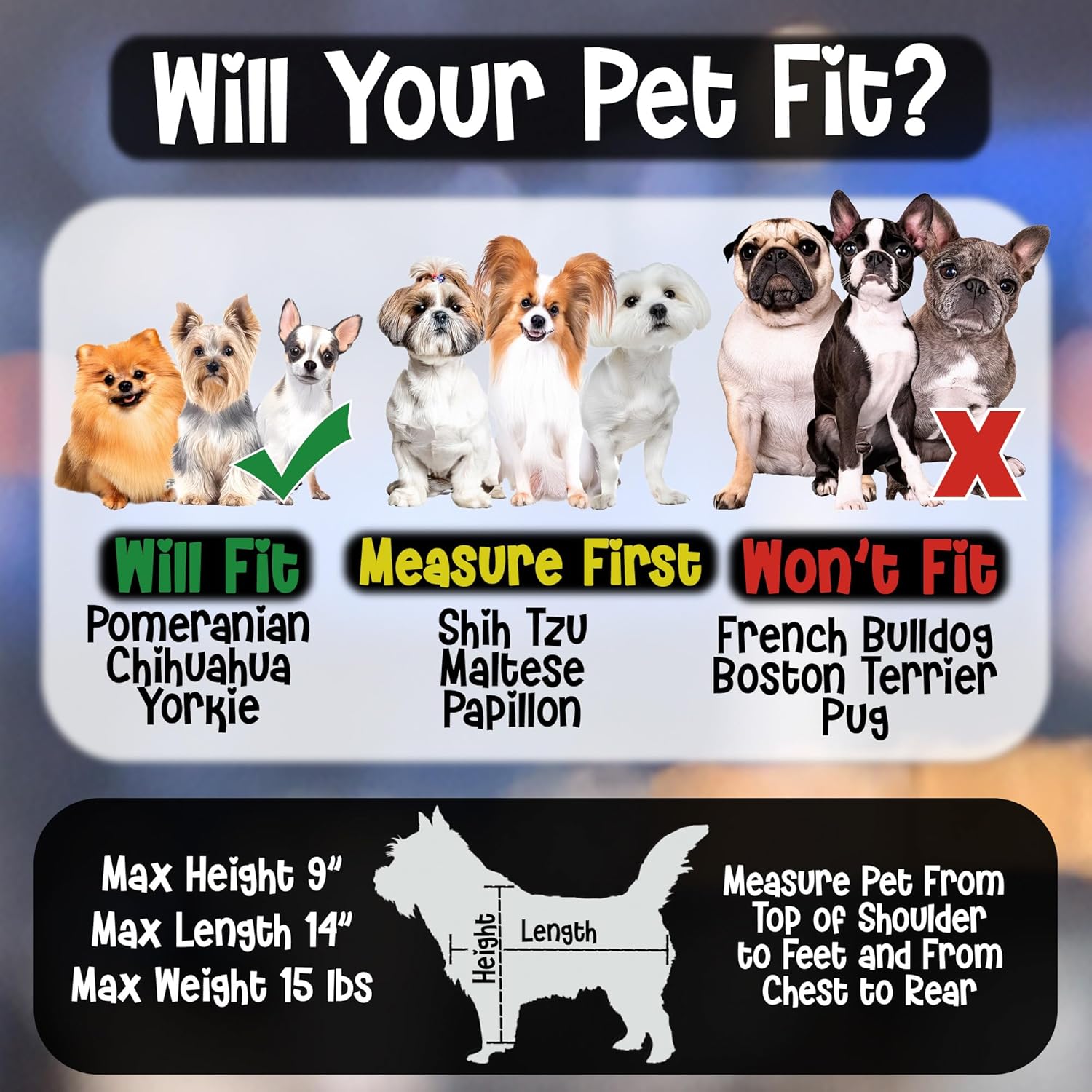- [Max Weight 15 lbs] Maximum pet dimensions 9 inches tall 14 inches long and 15 lbs. This is a carrier for small dogs or cats if your pet is larger it will be a tight fit.
