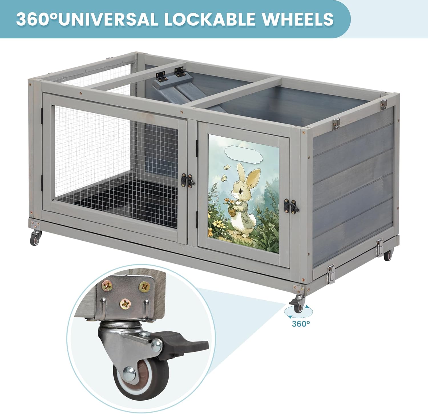 2-Story Wooden Rabbit Hutch for Outdoor & Indoor, Bunny Cage Rabbit House with Wheels, Trays, Ramp, Pet Home for Guinea Pigs, Chickens, Chicken Coop, Gray with Colorful Patterns