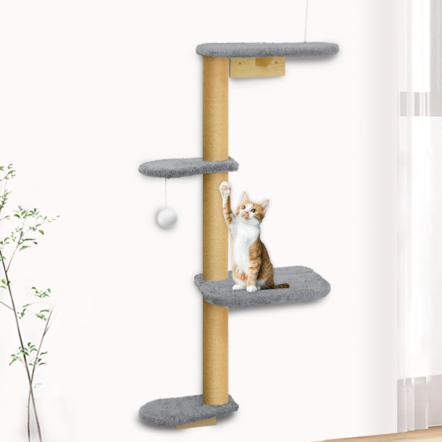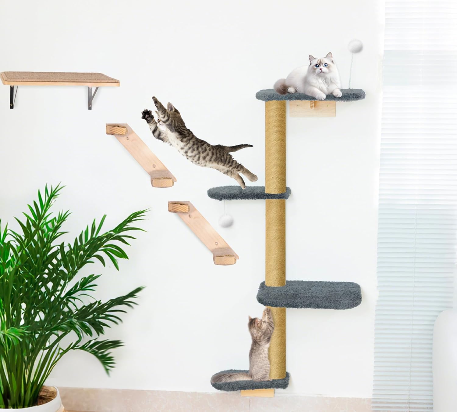 - Triple-Anchor Mount for Steady Support: This wall-mounted cat climber anchors at three secure points to ensure maximum stability. From climbing to jumping, your catâs movement stays supported. The jute posts provide traction during ascent, and the soft plush cushions minimize impact when landingâkeeping curious kittens safe and confident.