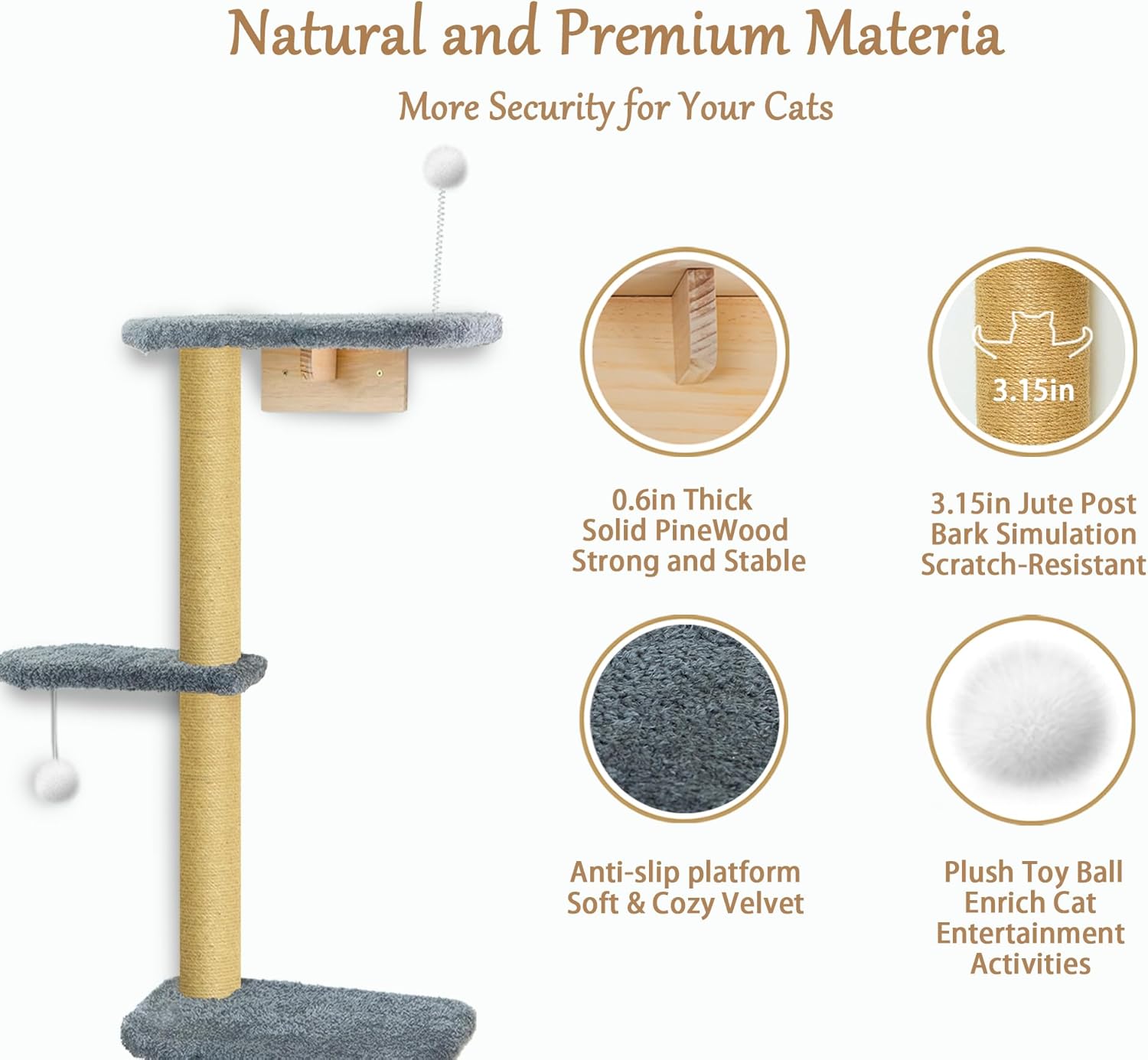 - Plush-Covered Platforms for Cozy Landings: Crafted with pine wood and wrapped with jute rope, the frame offers durability and scratch resistance. Each level is topped with soft grey plush cushionsâcomfortable, warm, and anti-slip, ideal for napping after playtime. The materials are gentle on paws yet tough enough for daily activity and climbing.