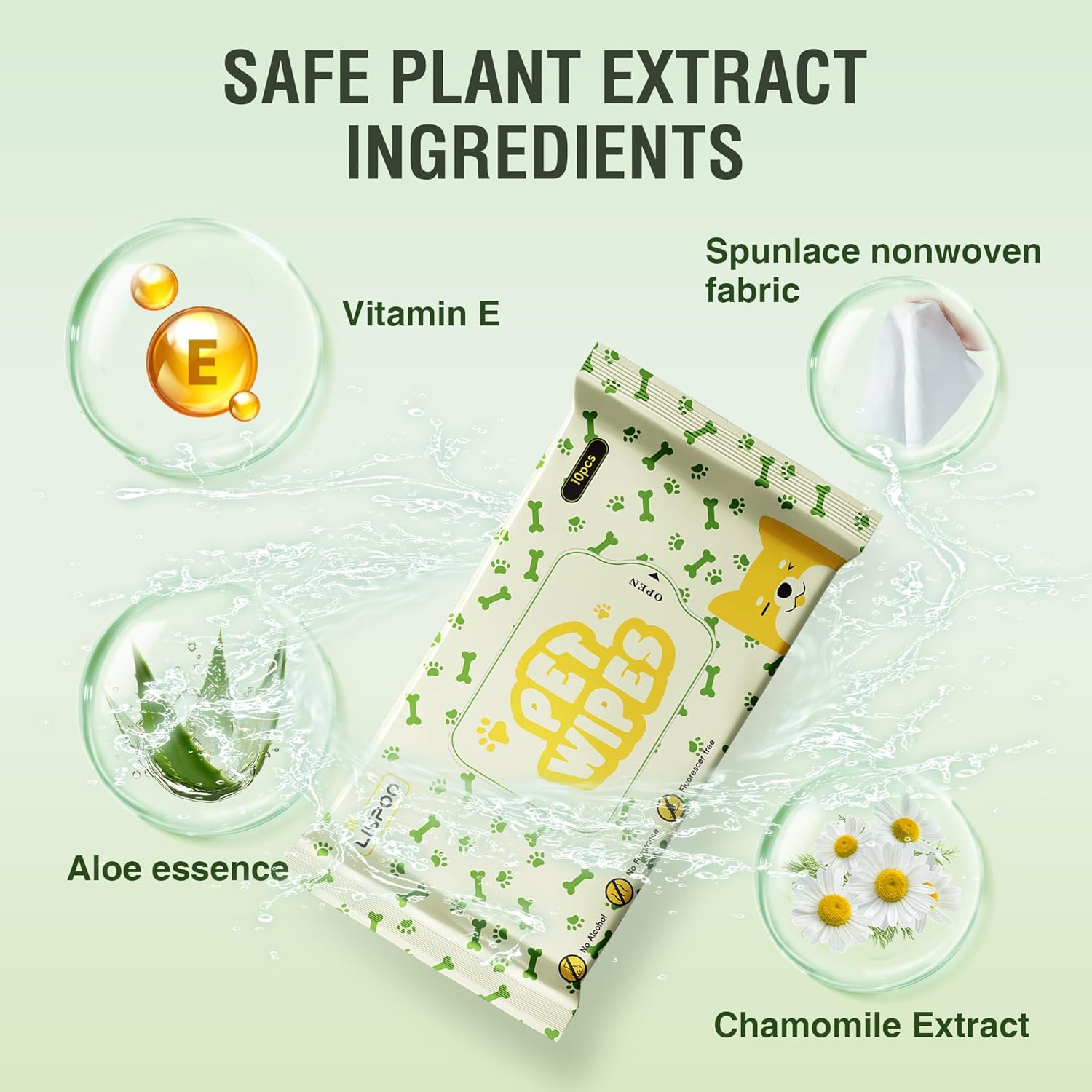 - Widely applicable, universal for all dogs and cats: LISPOO pet wipes are crafted with a mild, plant-based material to safely remove dirt, odors, and stains from your-pets paws and butt. Hypoallergenic and non-irritating dog wipes and cat wipes are suitable for daily dog and cat grooming care or cleaning after going out. Natural ingredients protect the delicate skin of pets.
