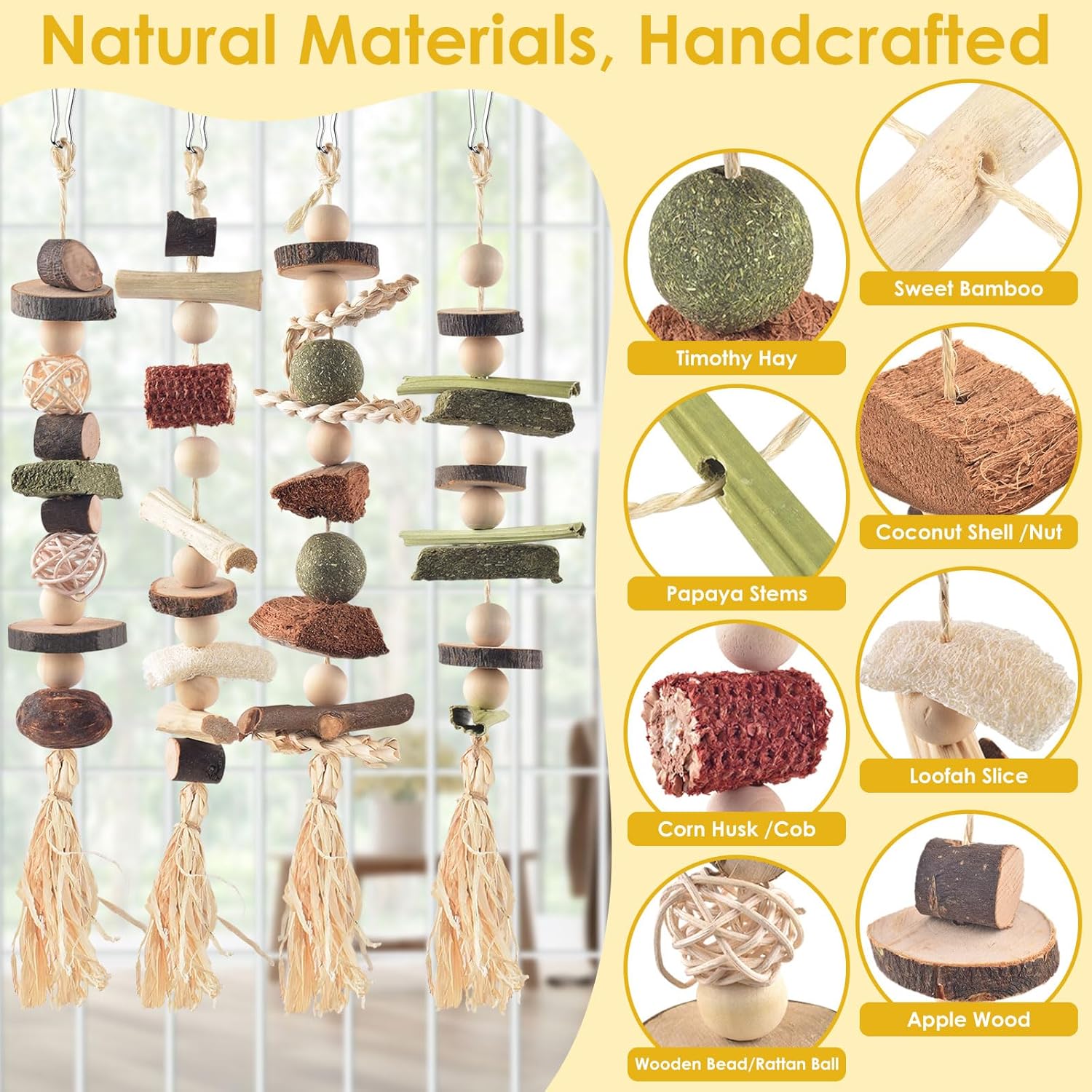 - Bunny Toy Set: DBNESS 4pcs rabbit toys are crafted from 100% natural materials including apple wood, timothy hay, loofah slices, rattan balls, nuts, corn husks/cobs, coconut shells, sweet bamboo, and papaya stems. Bunny chew toys for rabbits provide safe play and chewing opportunities for your lovely pets. These materials are not only fiber-rich, which helps clean your pet's teeth and promote digestion, but they also aid in exercising and relieving stress