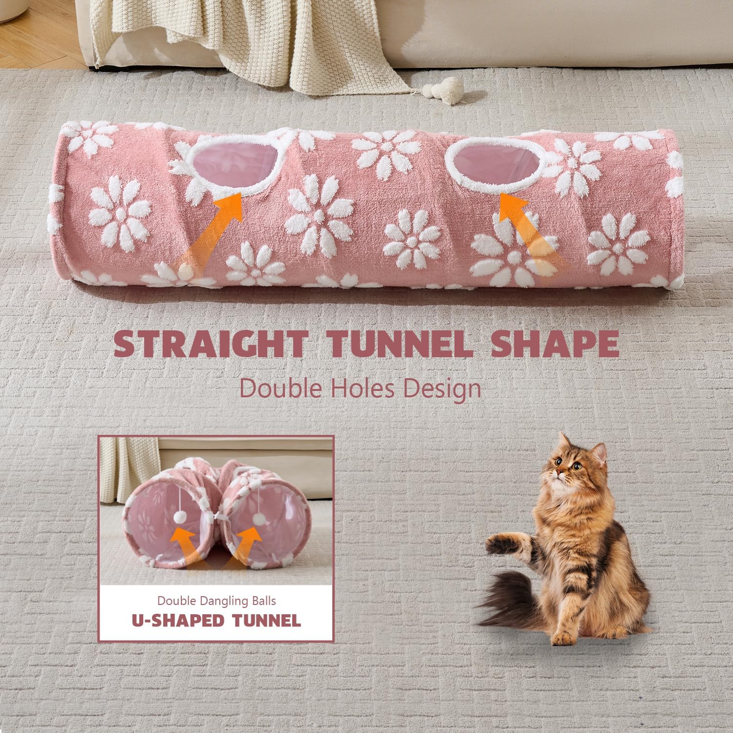 Straight Cat Tunnel for Indoor Cats 47"x12", Cute Cat Toys Collapsible Tunnel Tube with Balls for Puppy Kitten Rabbit, Pink Flower