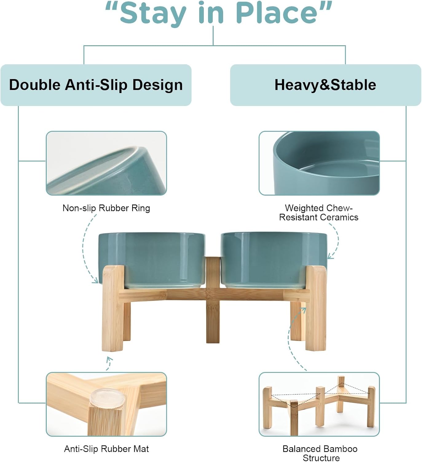 - Stable, Tip‑Resistant Design – A solid bamboo frame with Chew‑Resistant Heavyweight Ceramic, wide stance, and slip‑proof silicone pads join forces to create raised dog bowls that STAY IN PLACE on tile, wood, or laminate. Fewer spills mean cleaner floors and no accidental gouges or scratches or noisy