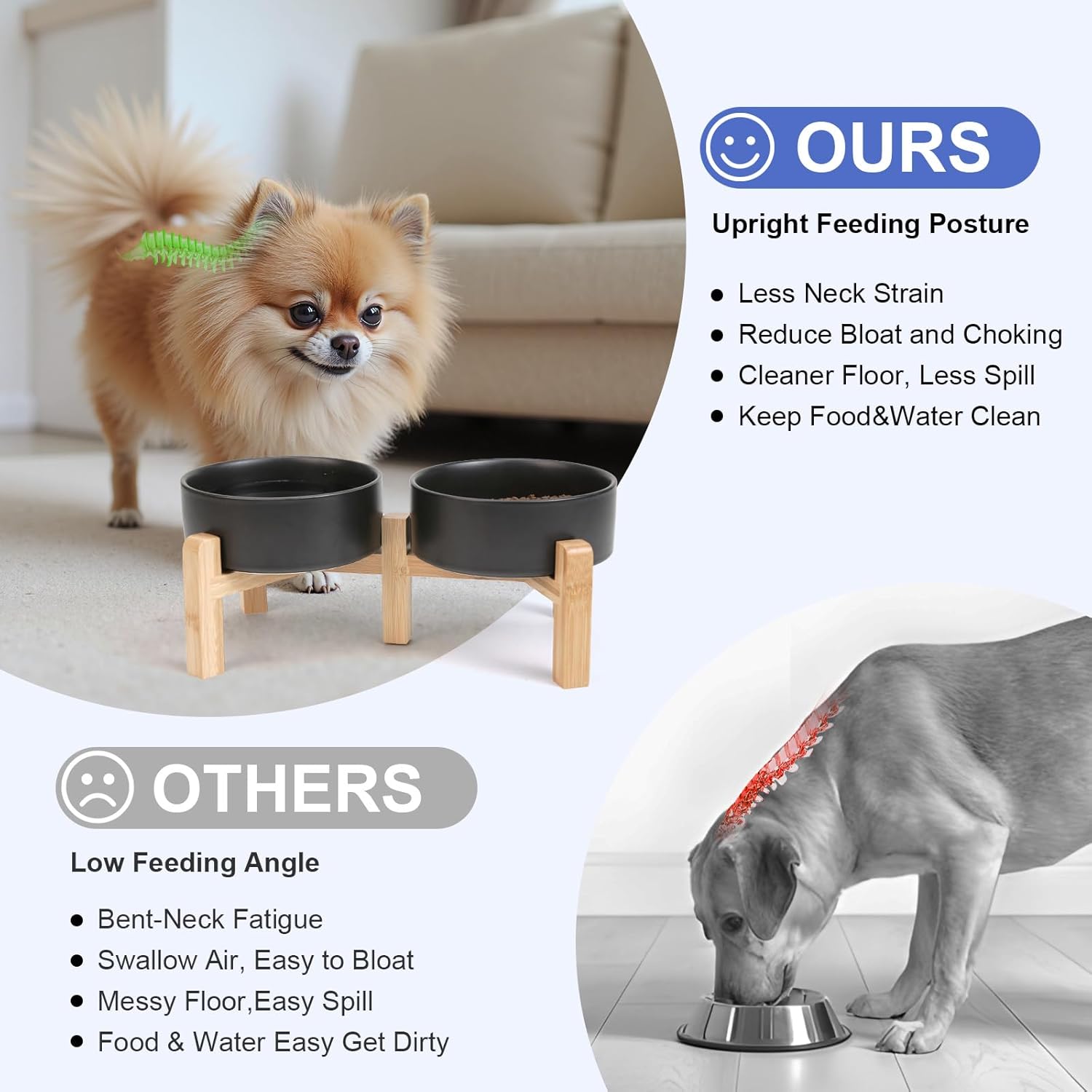 - Stable, Tip‑Resistant Design – A solid bamboo frame with Chew‑Resistant Heavyweight Ceramic, wide stance, and slip‑proof silicone pads join forces to create raised dog bowls that STAY IN PLACE on tile, wood, or laminate. Fewer spills mean cleaner floors and no accidental gouges or scratches or noisy
