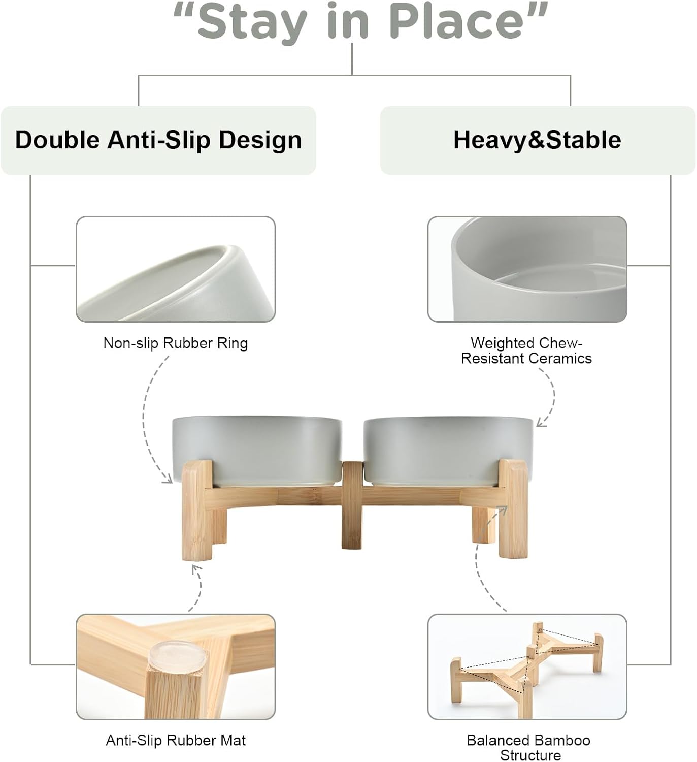 - Stable, Tip‑Resistant Design – A solid bamboo frame with Chew‑Resistant Heavyweight Ceramic, wide stance, and slip‑proof silicone pads join forces to create raised dog bowls that STAY IN PLACE on tile, wood, or laminate. Fewer spills mean cleaner floors and no accidental gouges or scratches or noisy