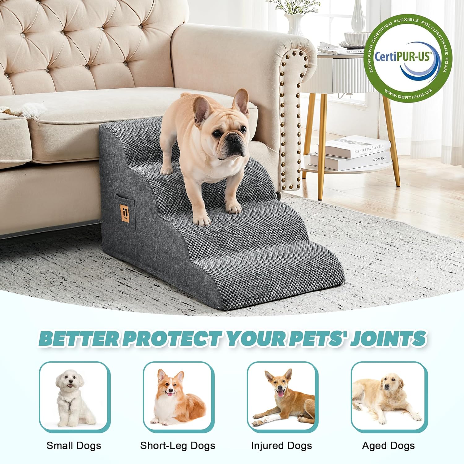 - GENTLE SLOPE DESIGN: Our dog stairs adopt a lower angle arc design, which makes it easy for pets to climb onto the bed or sofa, not only suitable for small dogs, elderly dogs, pets with limited mobility, also suitable for old cats. Besides, the dog stairs for small dogs and cats can also reduce joint pressure and protect the knees and lumbar spine, providing a comfortable climbing experience for your pets.