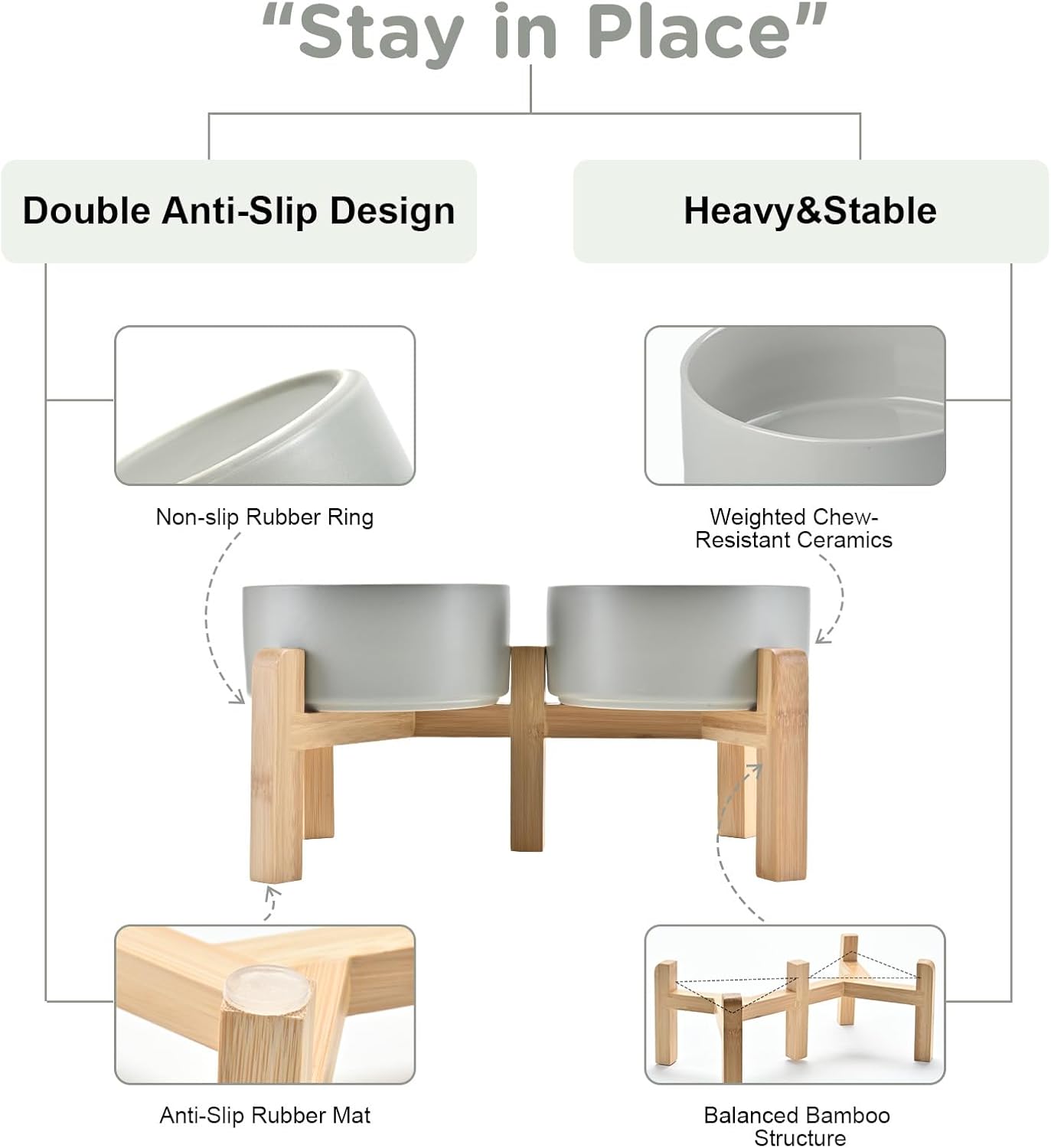 - Stable, Tip‑Resistant Design – A solid bamboo frame with Chew‑Resistant Heavyweight Ceramic, wide stance, and slip‑proof silicone pads join forces to create raised dog bowls that STAY IN PLACE on tile, wood, or laminate. Fewer spills mean cleaner floors and no accidental gouges or scratches or noisy