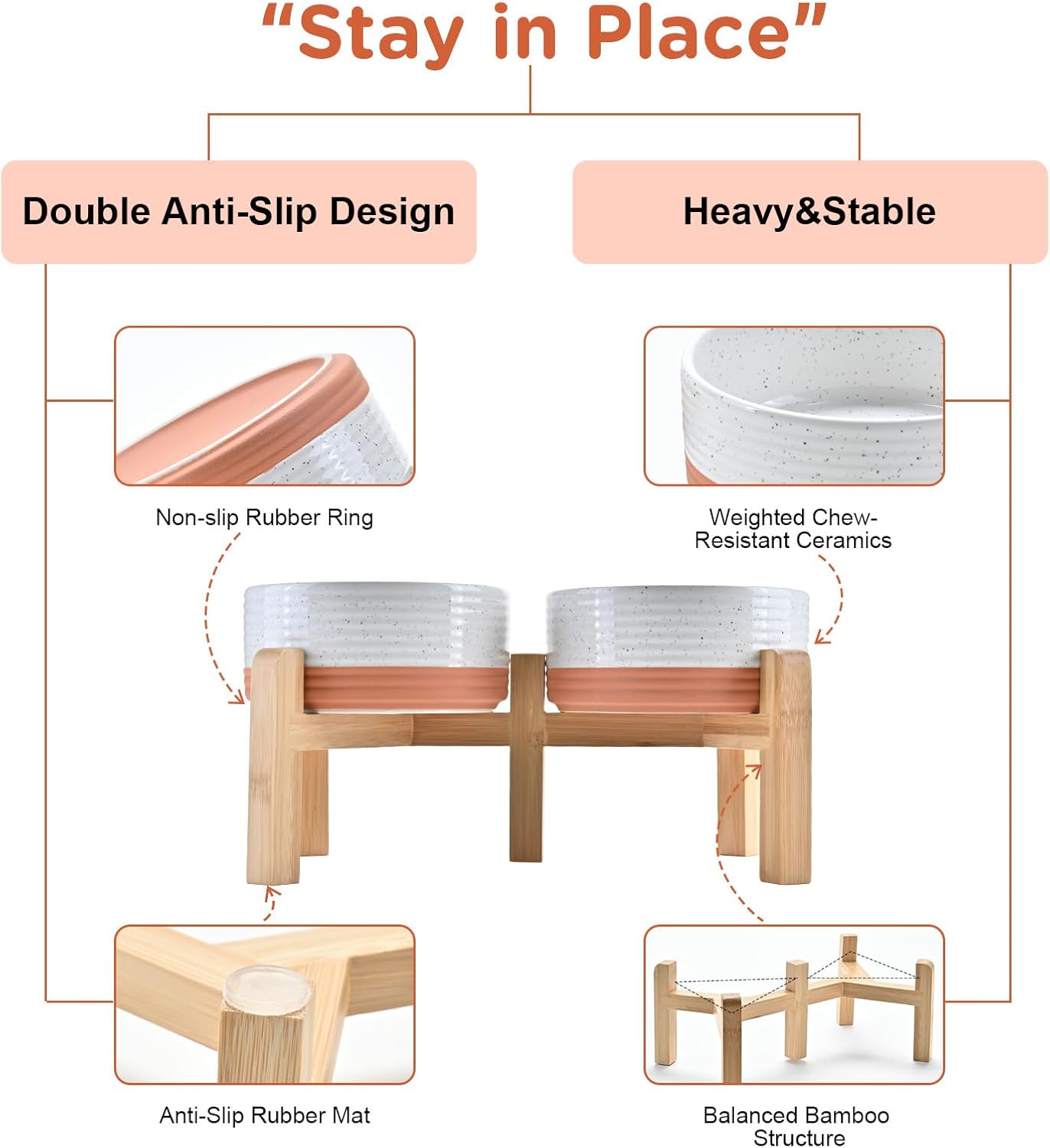 - Stable, Tip‑Resistant Design – A solid bamboo frame with Chew‑Resistant Heavyweight Ceramic, wide stance, and slip‑proof silicone pads join forces to create raised dog bowls that STAY IN PLACE on tile, wood, or laminate. Fewer spills mean cleaner floors and no accidental gouges or scratches or noisy