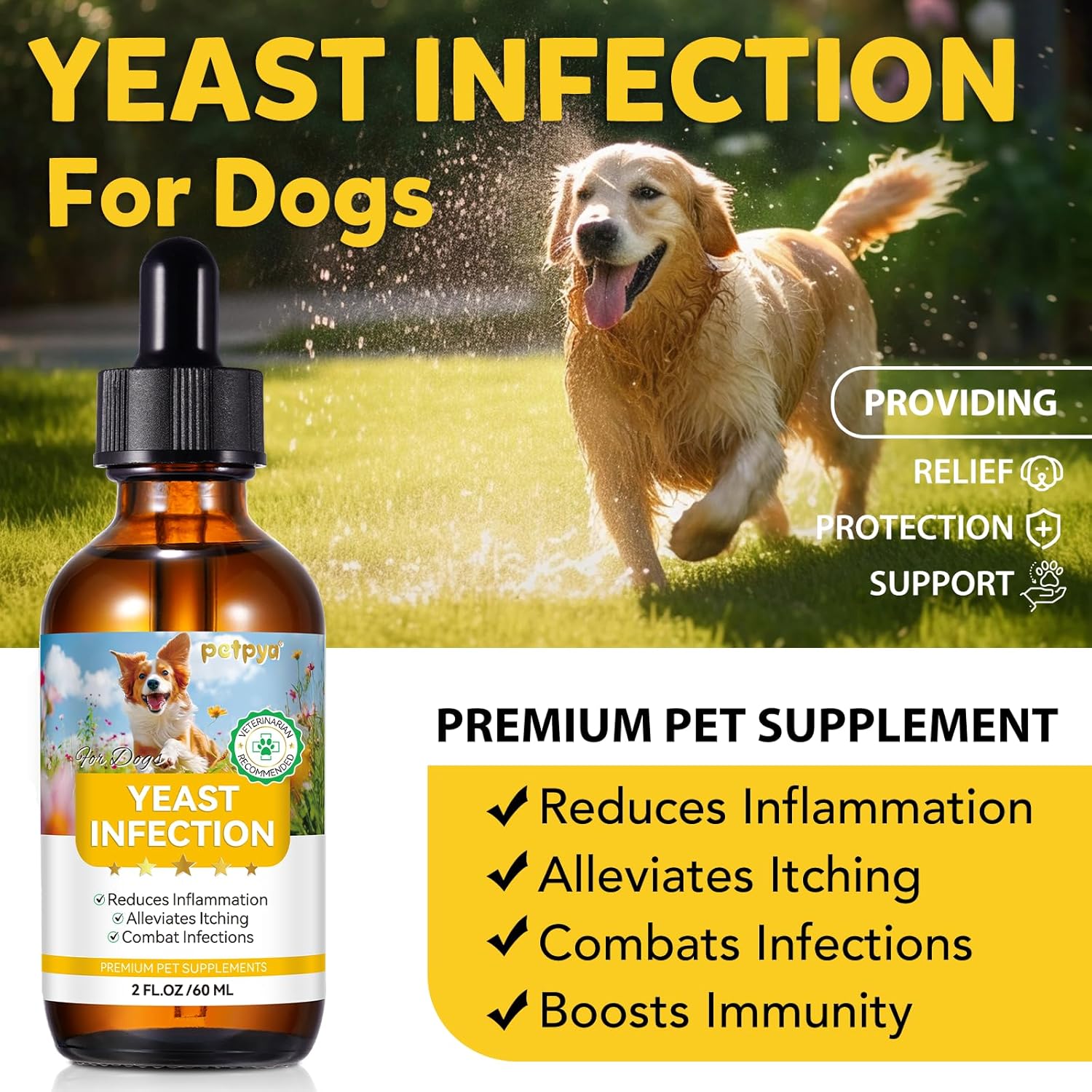 - Quick Relief -This Yeast Infection Treatment for Dogs is an herbal supplement specifically made to help dogs suffering from yeast infections and puppies experiencing allergies and immune system health issues. This Yeast Infection Treatment for Dogs provides quick relief from the symptoms of yeast infections, so they can get back to feeling best in no time.