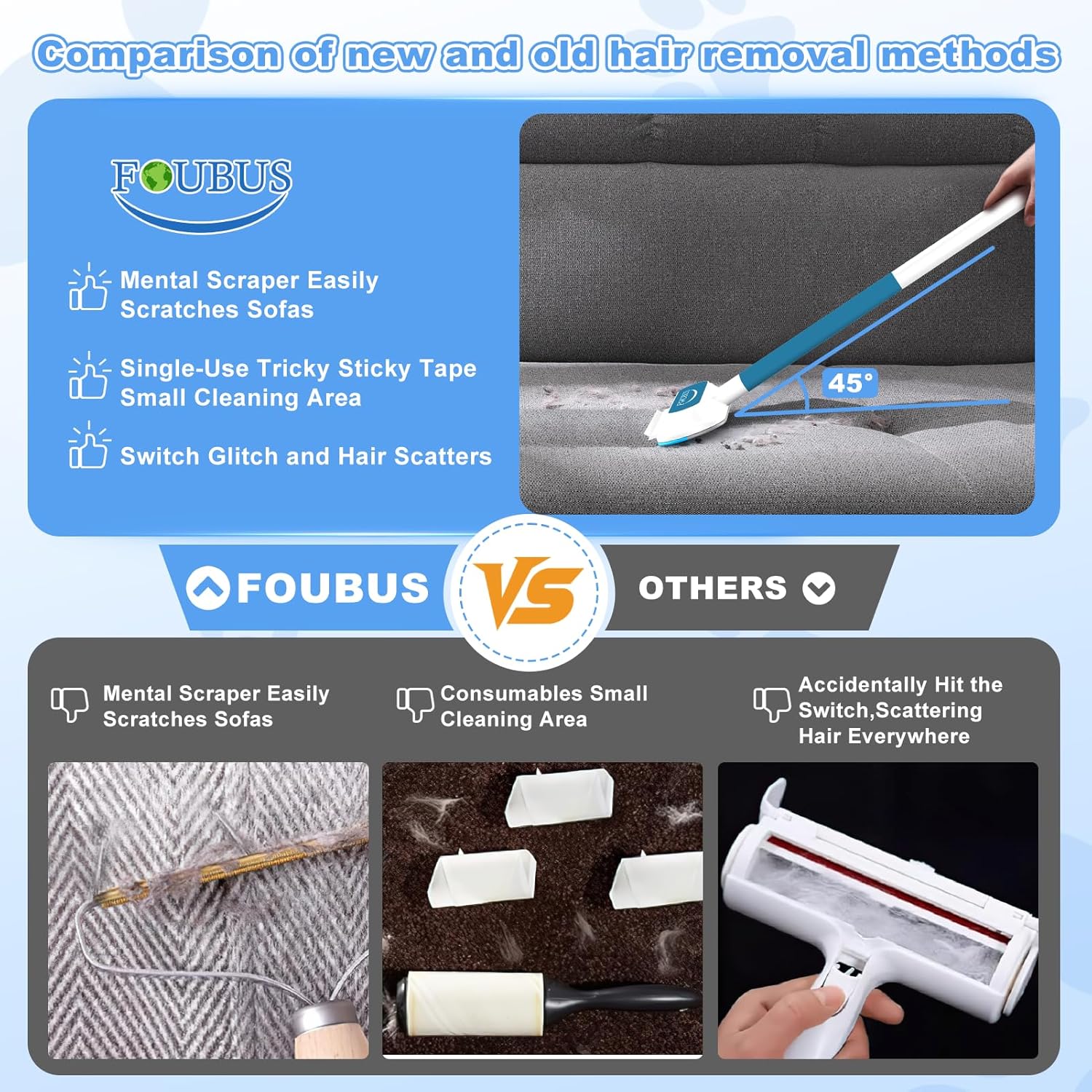 - 🐈Special High-density Fiber Design,Efficient Pet Hair Removal🐾 FOUBUS pet hair removal tool with Velvet surface, dense distribution of fine hair in both directions, simple 45-degree back-and-forth motion, effortlessly resolves deep hair and hard-to-remove dog and cat hair. Gentle on your sofa and rug fabrics! No surface damage. Far superior to traditional lint rollers for pet hair or sticky rollers. The hair clings to the tool and can be easily disposed of, ensuring an impeccably clean.