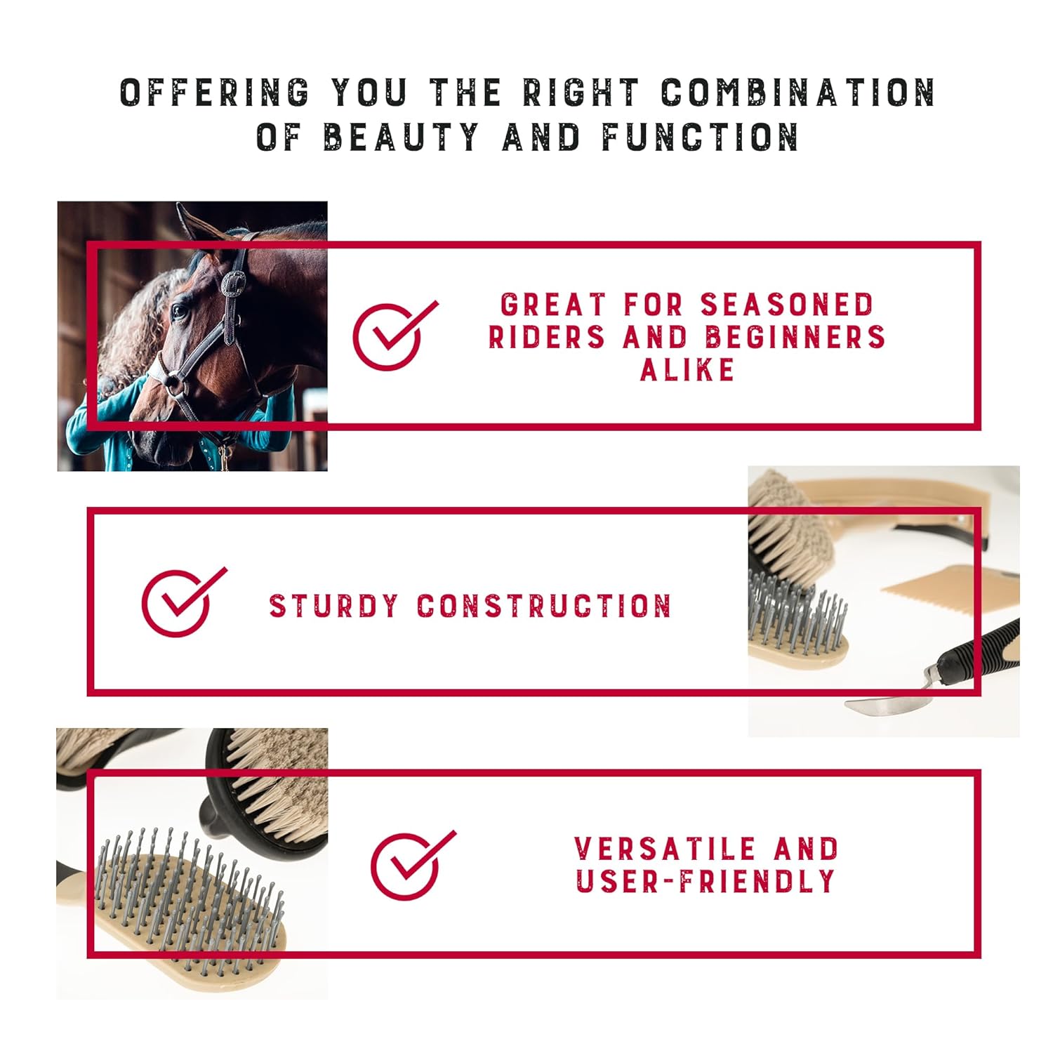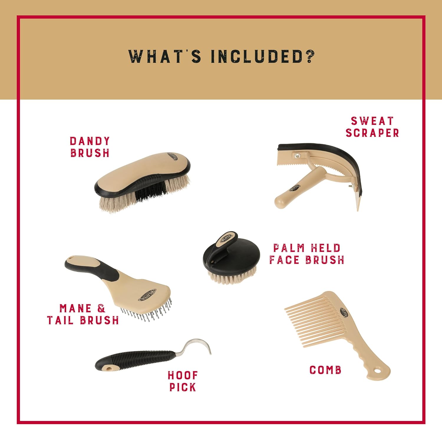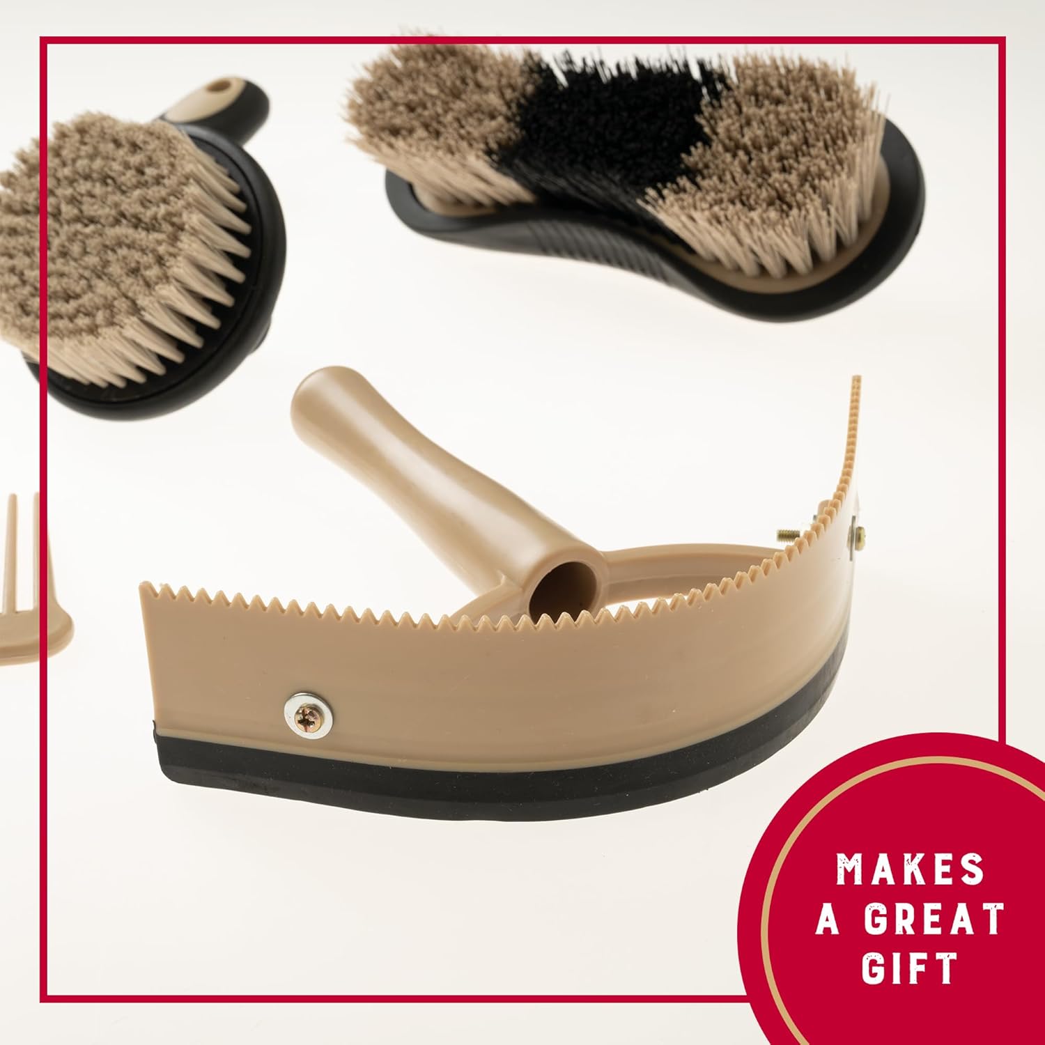 - Horse Grooming Kit: Ensure effortless cleaning and grooming of your horses with our horse grooming set; these 6-piece horse essentials include a comb, hoof pick, palm-held brush, mane and tail brush, dandy brush, and sweat scraper/coarse curry combo