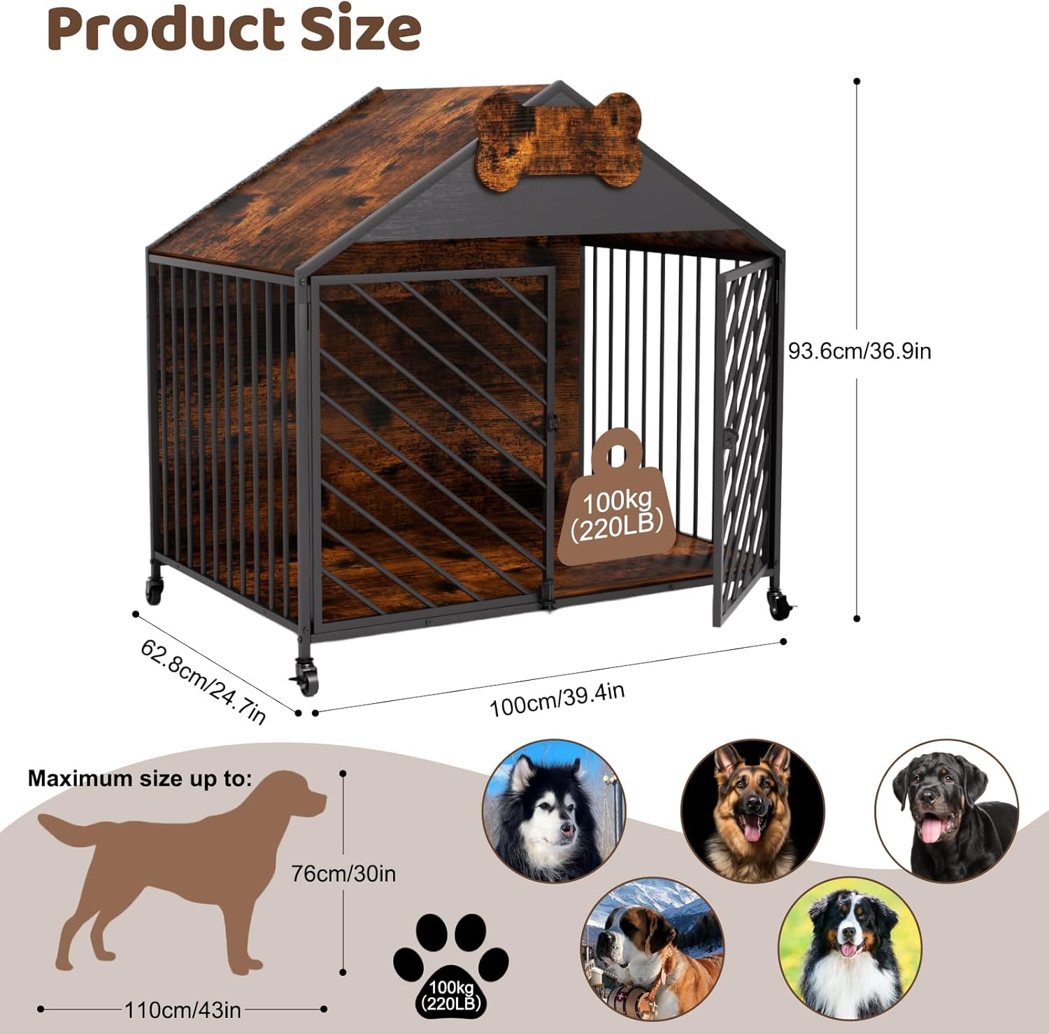 - Large Breed-Specific Engineering - This heavy duty dog cage offers a large dog crate interior (39.4"Lx24.7"Wx36.9"H) with 0.4" thickened steel tubes, maintaining a 220lbs capacity indoor dog house load capacity. The gable roof dog crate design provides 38% more head clearance than standard 36" crates for Labradors/German Shepherds, ensuring a durable dog kennel.