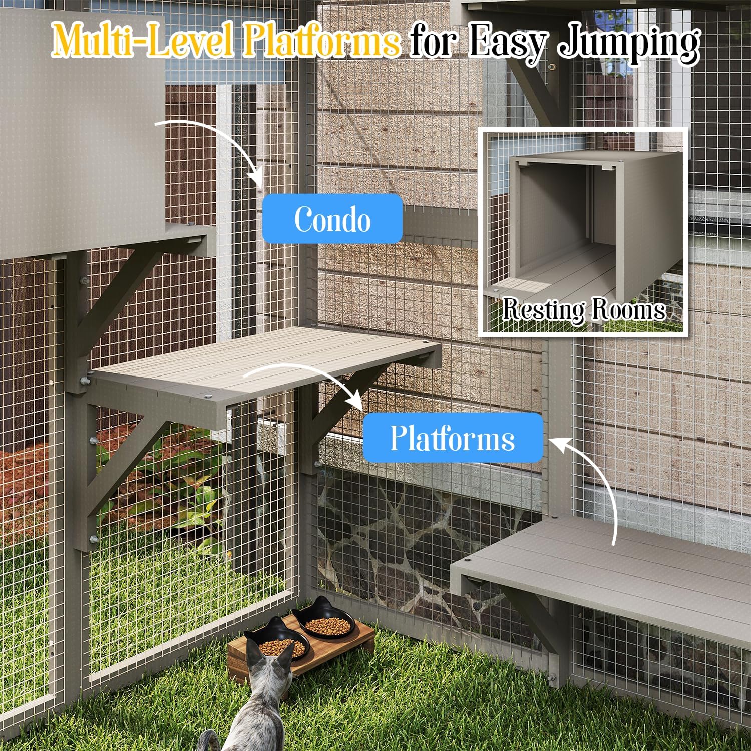 - 【Large Window Catio for Indoor Cats】 This large wooden catio connects to your home’s window, creating a safe outdoor space for 2–4 cats. It features 2 cozy condos, 6 climbing platforms, a waterproof Oxford cloth roof, and a removable window panel. The mesh is easy to trim for a custom window catio fit.