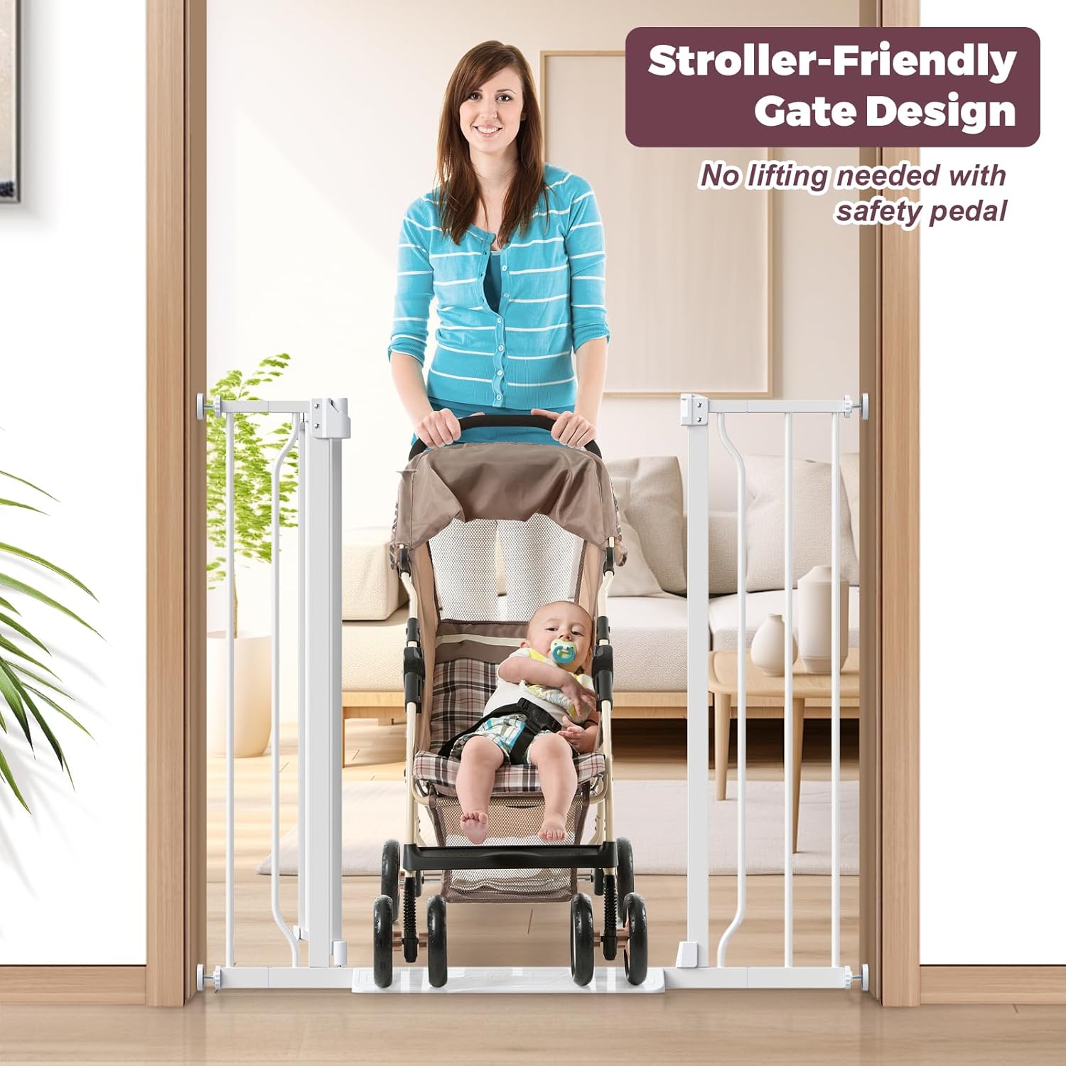 - Dual-Lock Safety: This baby gate for stairs features a secure dual-lock mechanism, ensuring curious children and pets stay safely contained while allowing adults to open it effortlessly with one hand. Parents can pass through with ease even while carrying groceries or a baby