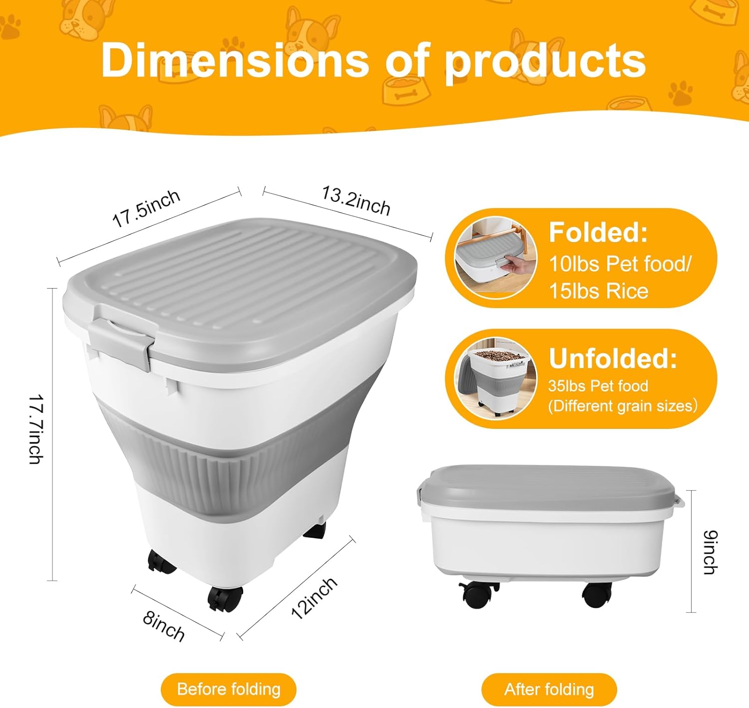 - FLEXIBLE FOLDING DESIGN: Unfolded size 17.7 x 17.5 x 13.2inches, can store 35 lbs of dog food or 60 lbs of rice, storage varies by food particle size