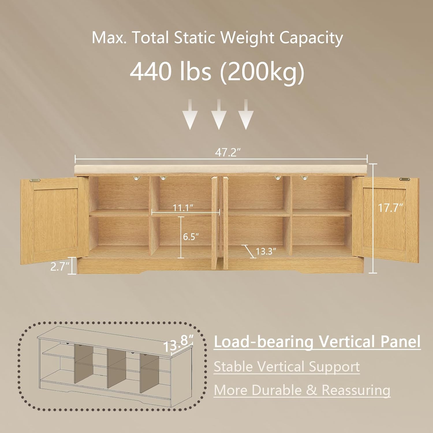 DINZI LVJ Shoe Bench, Entryway Storage Bench with Doors, Cushion, 2-Tier Shoe Rack with 8-Cubby, 47.2”L x 13.8”W Shoe Organizer Cabinet, Adjustable Shelf, Living Room, Bedroom, Natural with Rattan