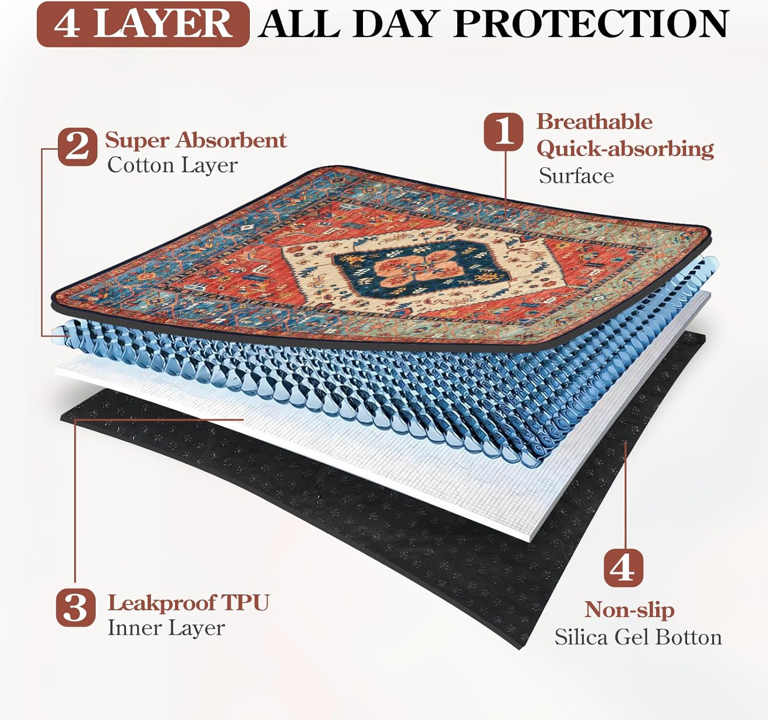 - 4-Layer Protection System: Made of four specialized layers for maximum performance, soft absorbent top layer, quick-drying middle layer, waterproof barrier layer, and non-slip bottom layer. This comprehensive protection system ensures liquids stay contained while the pad remains secure on your floor