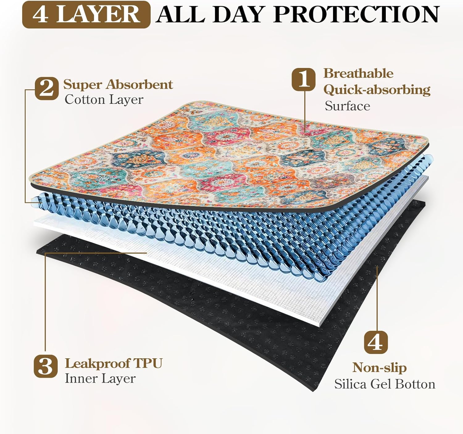- 4-Layer Protection System: Made of four specialized layers for maximum performance, soft absorbent top layer, quick-drying middle layer, waterproof barrier layer, and non-slip bottom layer. This comprehensive protection system ensures liquids stay contained while the pad remains secure on your floor