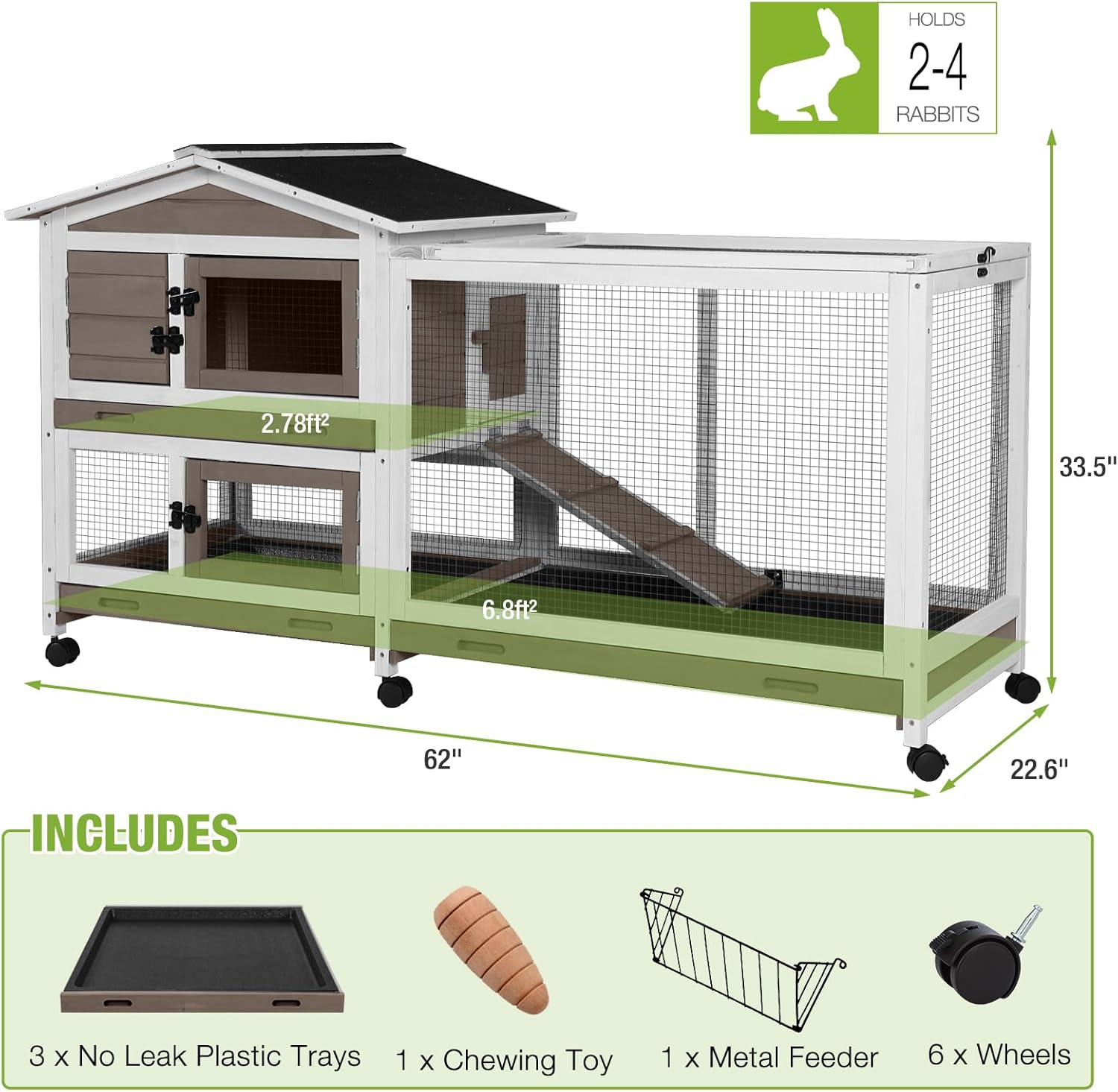 - Spacious 2-Story Design: Measuring 62"L x 22.6"W x 33.5"H, this large 2-story hutch provides ample room for rabbits, guinea pigs, or chicks to play and rest comfortably. The multi-level structure creates a secure, dynamic environment for small animals to thrive.