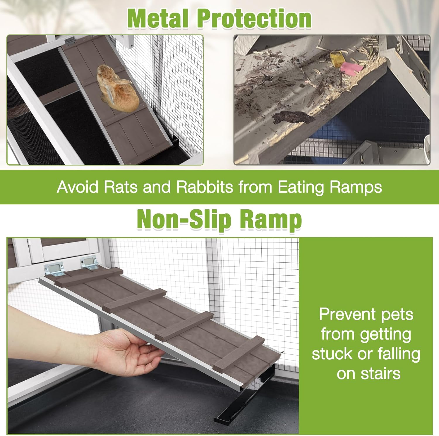 - Chew-Resistant Ramp Design: Our rabbit hutch's ramp has metal-edged corners to discourage chewing by rabbits and other small pets, enhancing the hutch’s long-term durability.This sturdy design protects against wear and tear, ensuring lasting use.