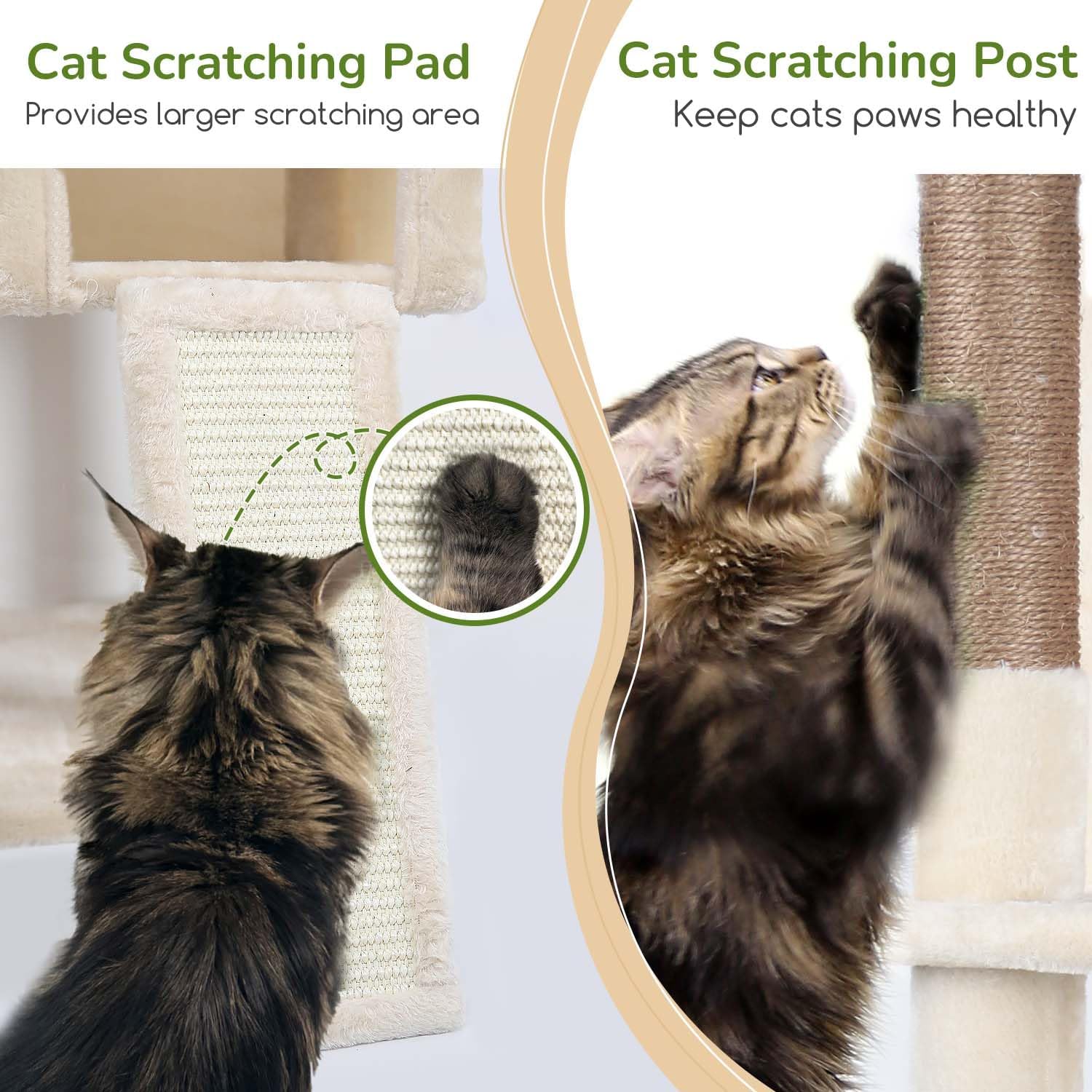 - SISAL ROPE SCRATCHING POST - The cat tower with 4 scratching posts and a scratching board is meticulously lined with durable natural sisal. The rough texture of sisal provides an ideal surface for your feline friends to scratch