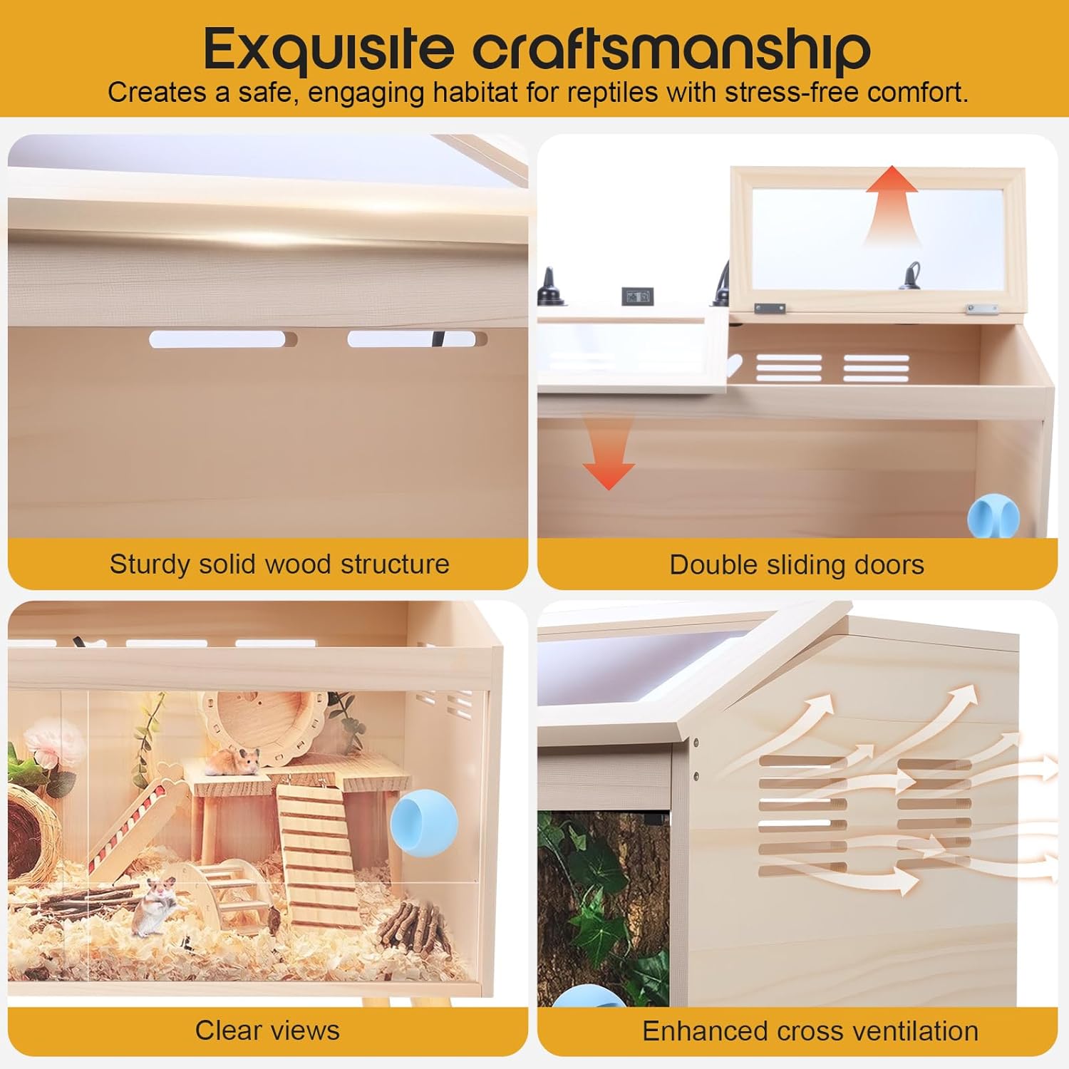 - Engineered for Reptile Health – Features adjustable side ventilation vents to balance airflow and humidity, paired with odor-resistant, eco-friendly wood for a safe habitat.