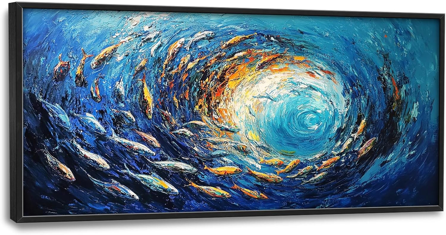 Extra Large Framed Abstract Ocean Fish Wall Art,Oversized Blue Sea Nautical Fish Wall Decor Pictures for Living Room,Canvas Print Painting Modern Artwork Bedroom Office Bathroom Home Decor 60L x30W