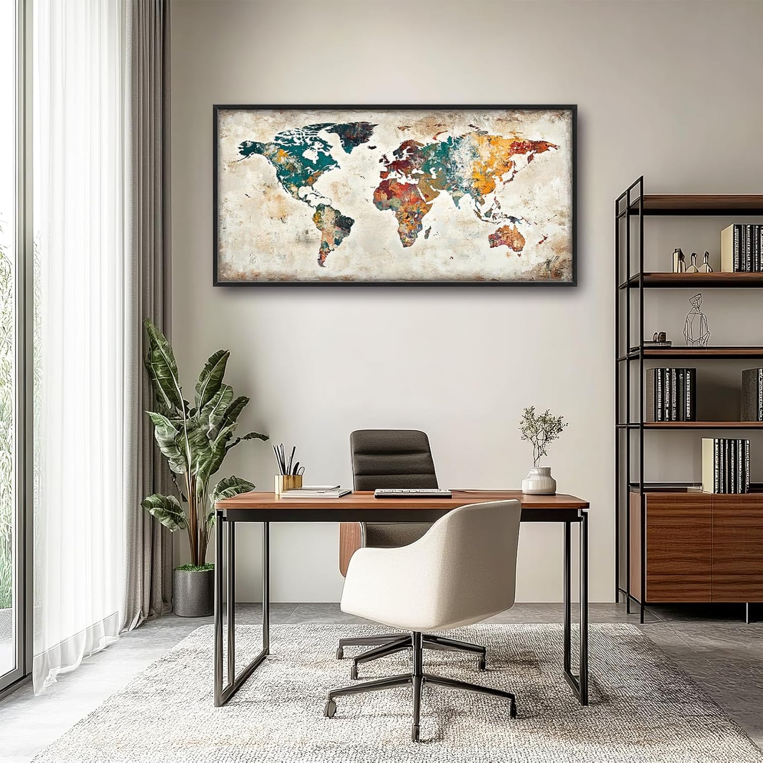 - 【Unique Design】 A vintage world map with distressed textures and colorful watercolor accents, evoking the spirit of global exploration. A soft oil painting on canvas, with neutral tones.