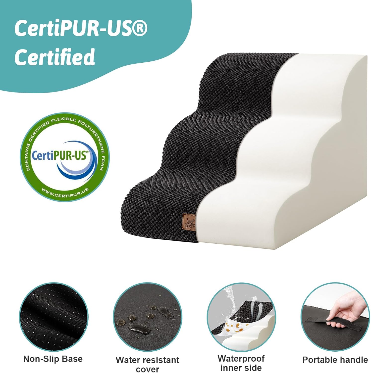- HIGH DENSITY SPONGE: Foam dog stairs can support up to 80 pounds. Stairs for dogs to get on the bed adopt 30D high-density pure sponge, which provides better support, reducing the pressure on the joints when pets repeatedly jump on high bed, sofa, couch and car. The stairs are covered with high-quality corduroy to provide additional stability
