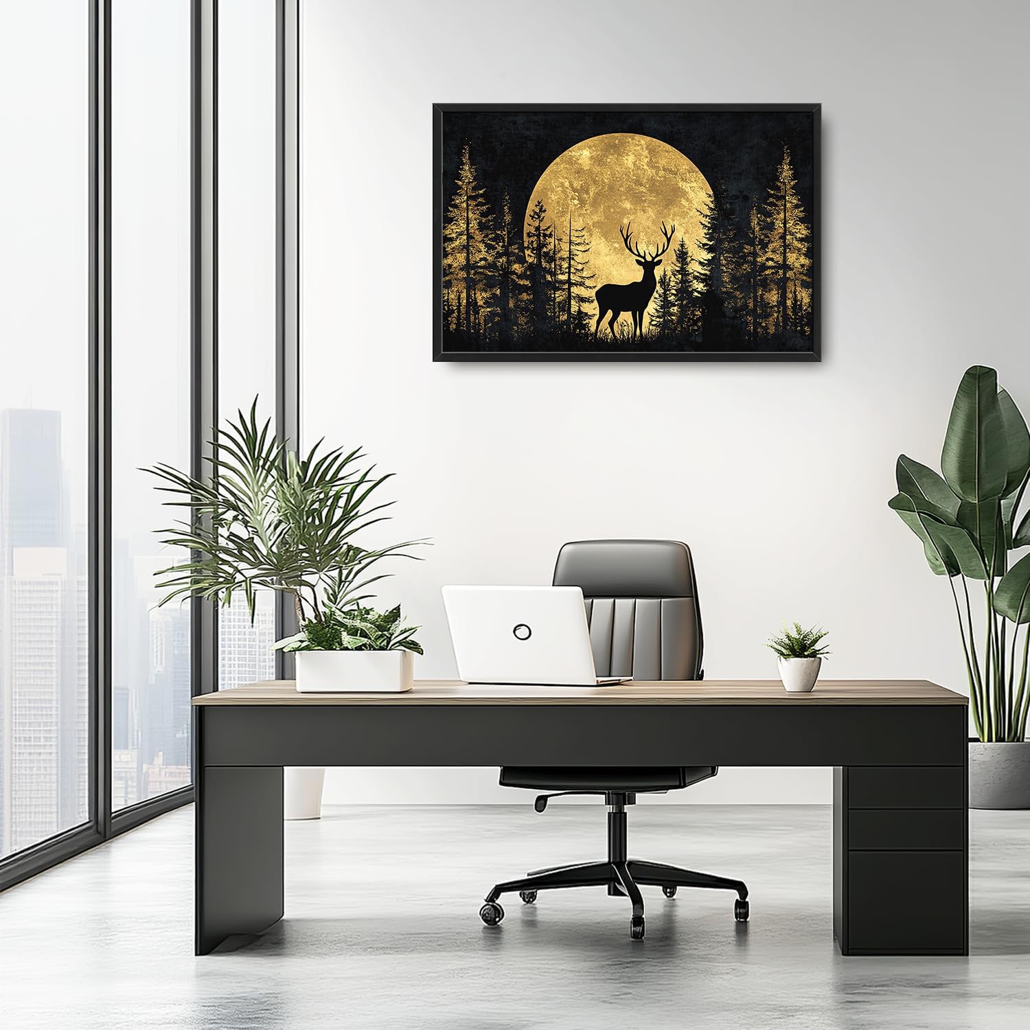 Large Moon Forest Deer Wall Art for Living Room, Black Deer Canvas Oversized Wall Decor, Elk Animal Aesthetics Framed Pictures Painting Print Artwork for Bedroom Office 36L" x 24W"