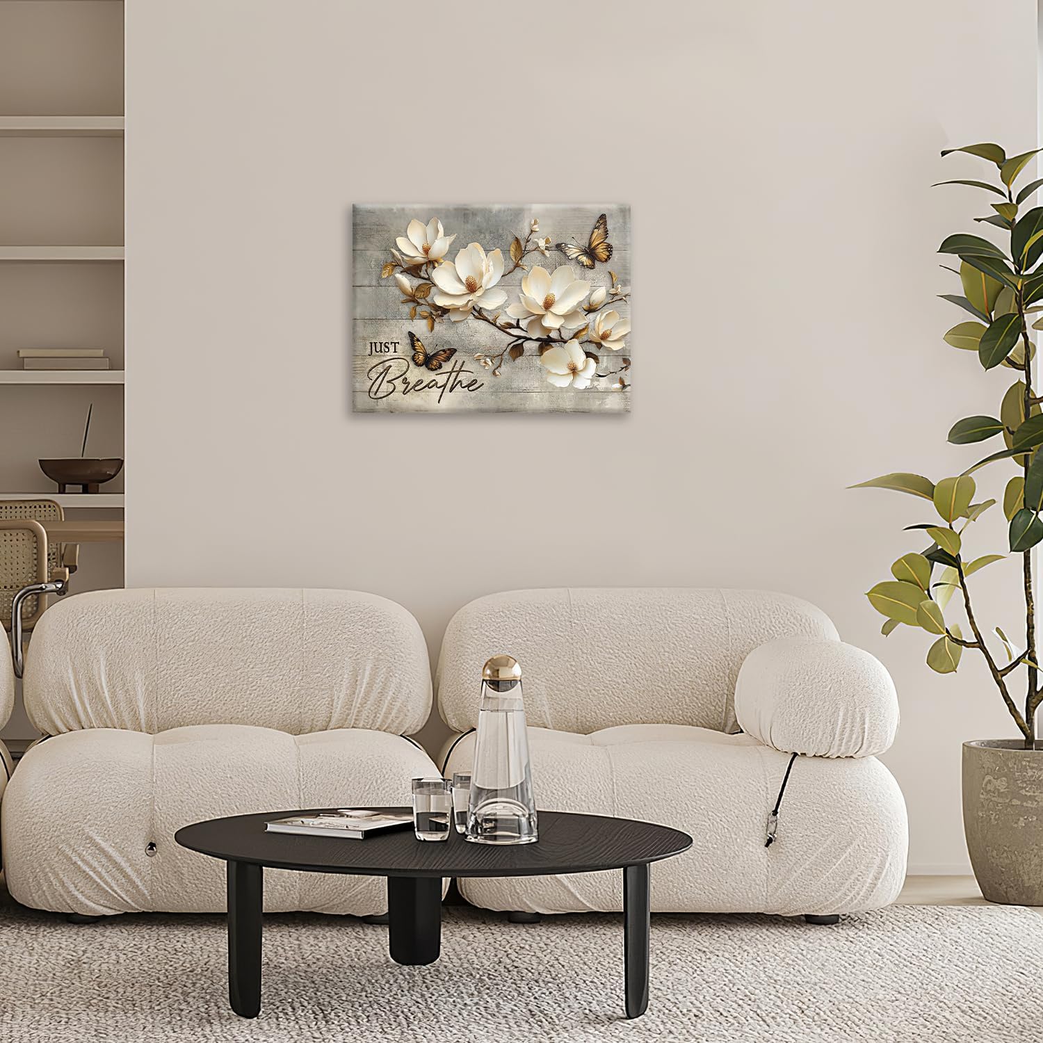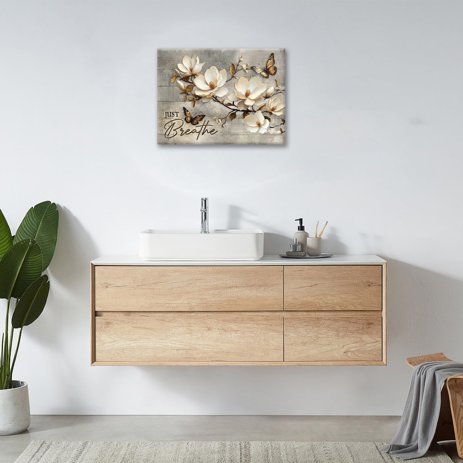 Floral Magnolia Bathroom Pictures Wall Art, Just Breathe Bathroom Wall Decor, Flower Butterfly Framed Painting Canvas Artwork for Bedroom Living Room Decorations 16"L x 12"W