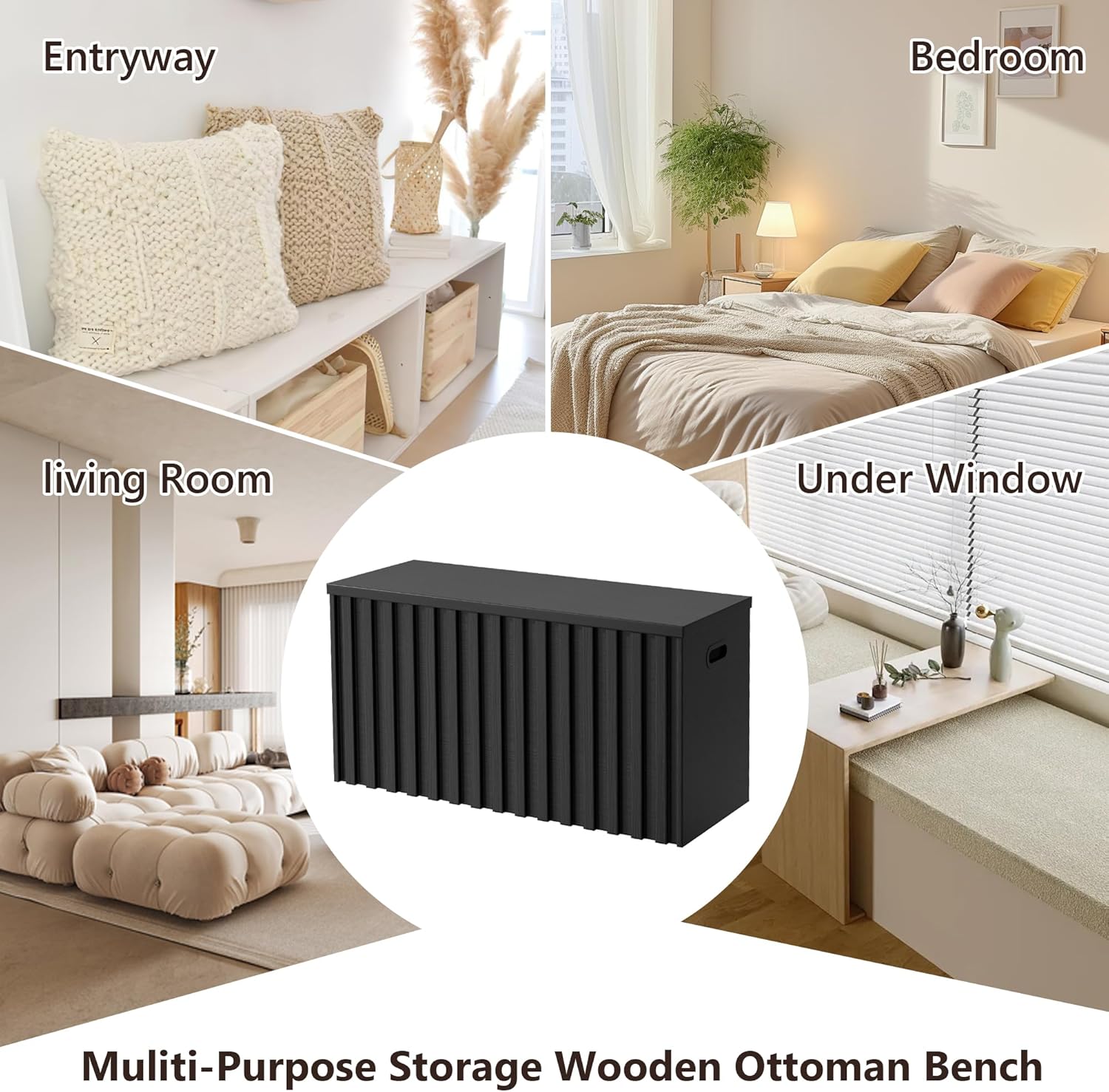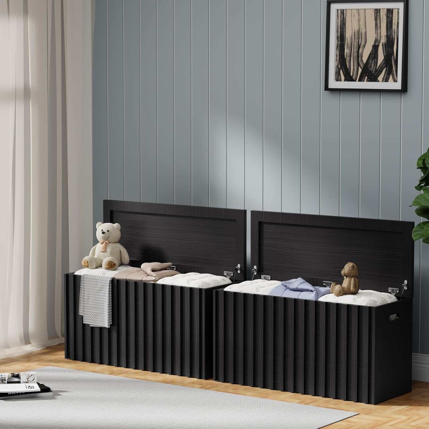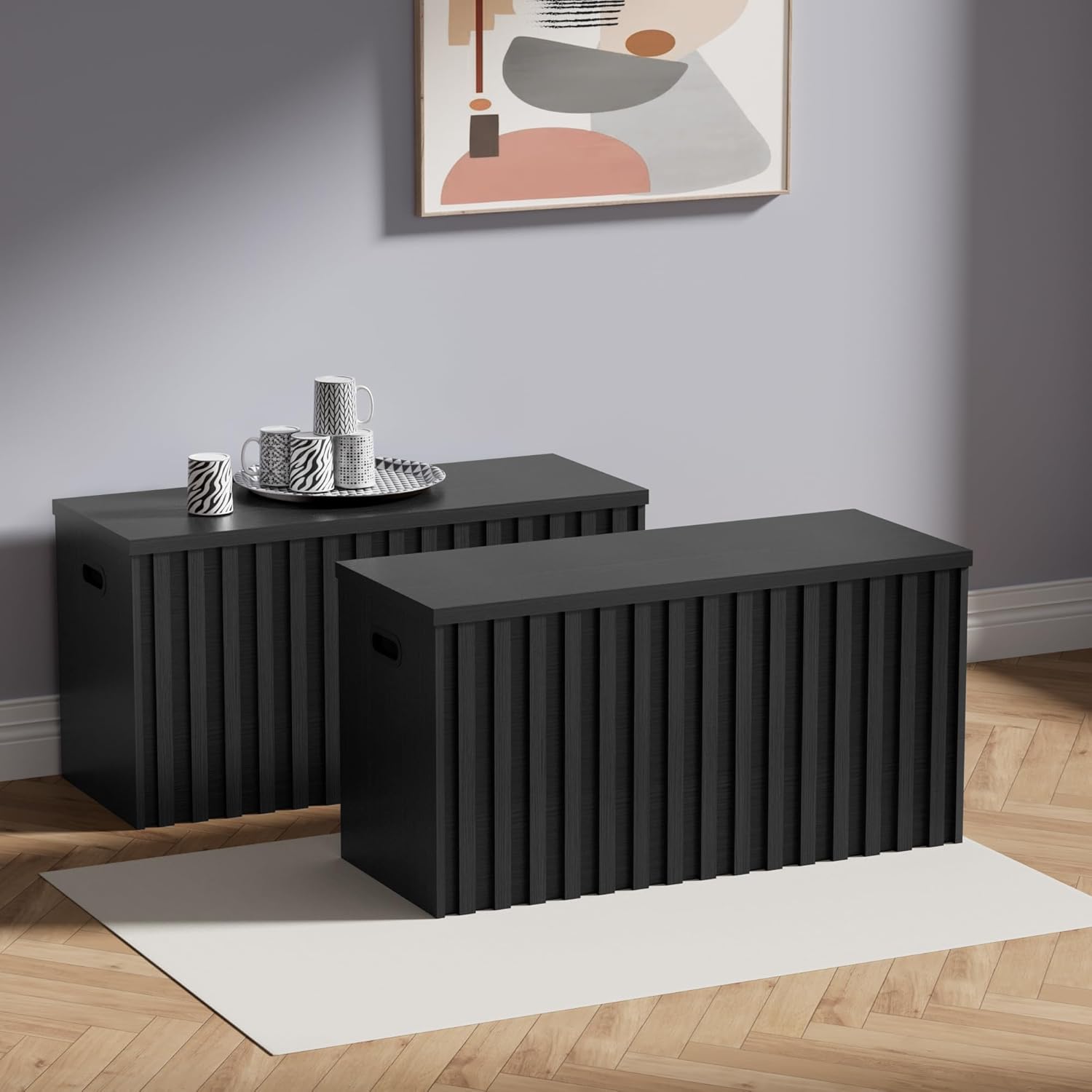 UEV Black Storage Bench Set of 2, 39.4" Fluted Wood Storage Trunk with 2 Safety Hinges, Sturdy Storage Chest, Storage Bench for Bedroom,Entryway, Living Room
