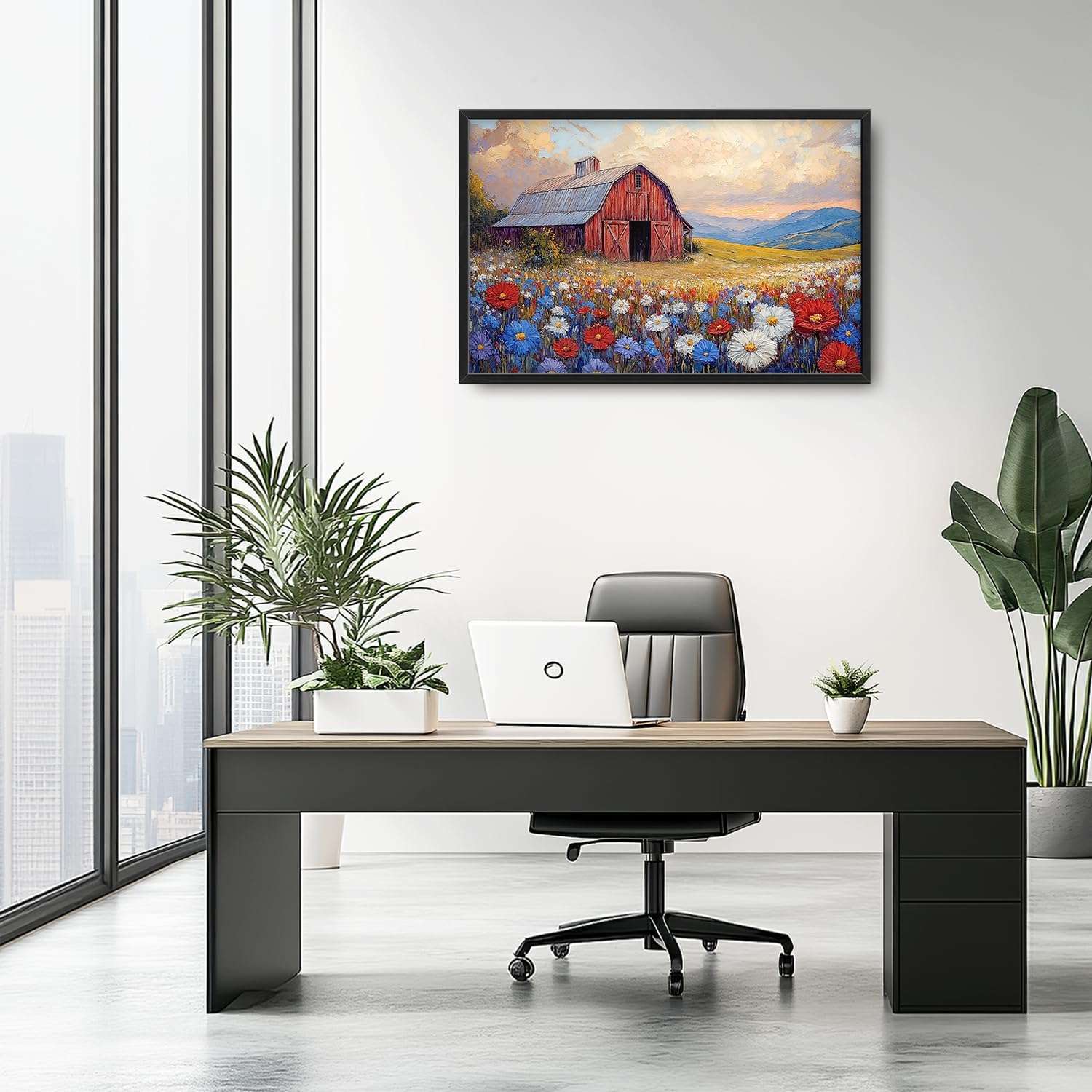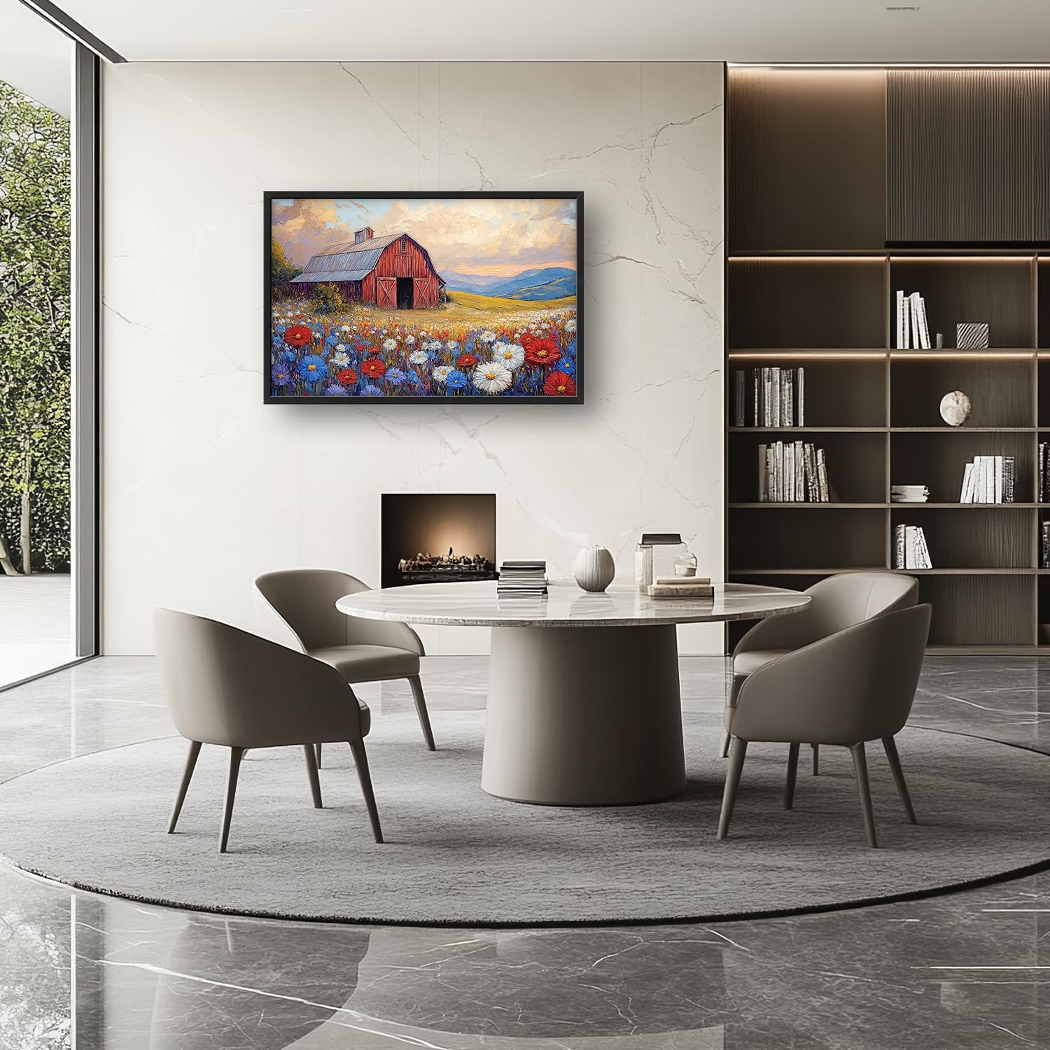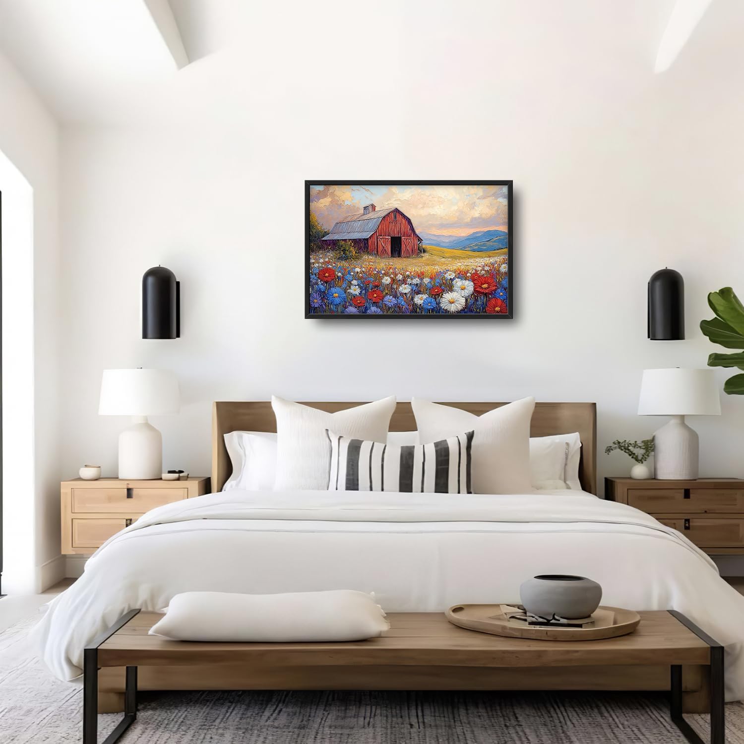Large Farmhouse Barn Daisy Wall Art for Living Room, Floral Landscape Canvas Oversized Wall Decor, Flower Scenery Framed Pictures Painting Print Artwork for Bedroom Office 36"L x 24"W