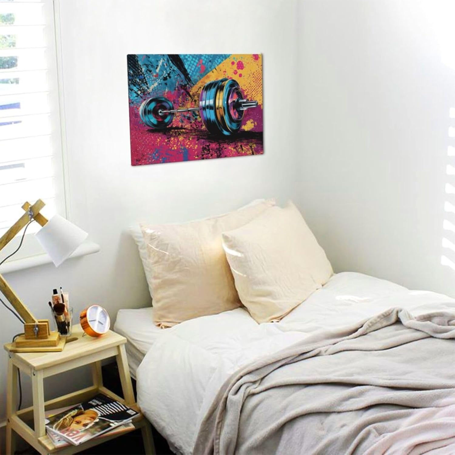 Gym Wall Art Weightlifting Fitness Canvas Wall Decor Barbell Sports Training Pictures Painting Banksy Street Graffiti Print Artwork Framed Decorations Gifts for Sports Lovers Gym Living Room Bedroom 12"x16"