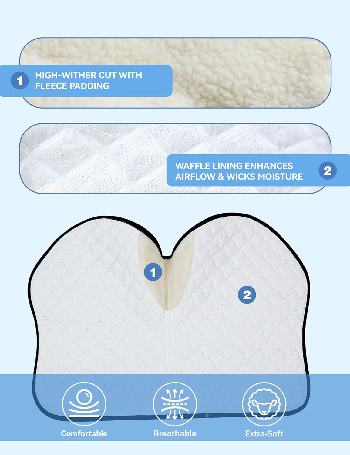 - High-Efficiency Moisture Wicking: Inner layer made of 65% polyester + 35% cotton blend, quickly wicks away sweat to keep the horse's back dry; soft waffle design ensures a snug, anti-slip fit without irritating the horse.
